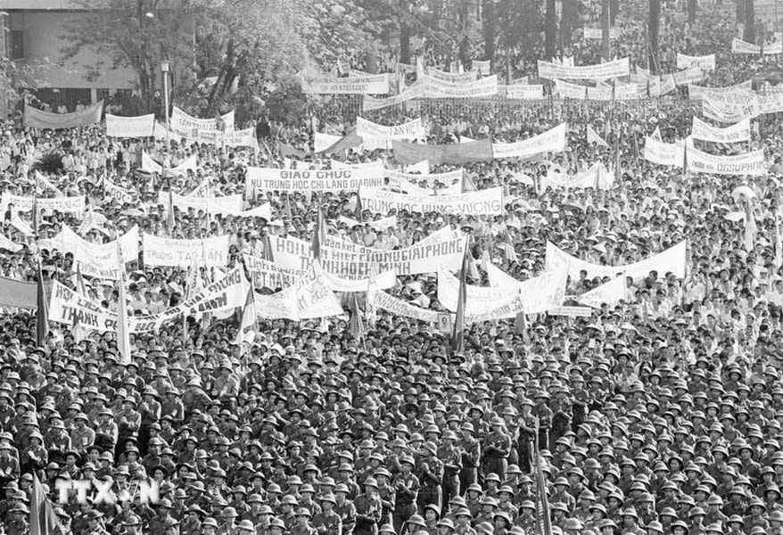Nhân dân thành phố Sài Gòn mít-tinh chào mừng Ủy ban Quân quản thành phố ra mắt 7/5/1975. (Ảnh: Lâm Hồng Long/TTXVN)