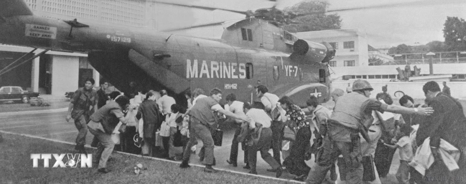 Trước sức tấn công của quân giải phóng, nhân viên Đại sứ quán Mỹ vội vã tháo chạy lên máy bay trực thăng tháo chạy khỏi Sài Gòn. (Ảnh: TTXVN)