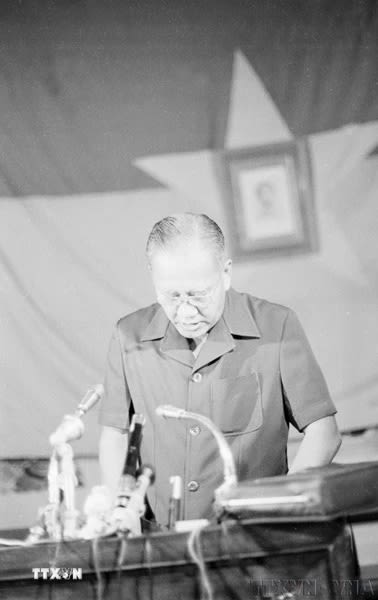 Tổng thống Dương Văn Minh đại diện nội các ngụy quyền cảm ơn cách mạng sau khi tuyên bố đầu hàng vô điều kiện, kết thúc chiến tranh Việt Nam, ngày 30/4/1975. (Nguồn: TTXVN)
