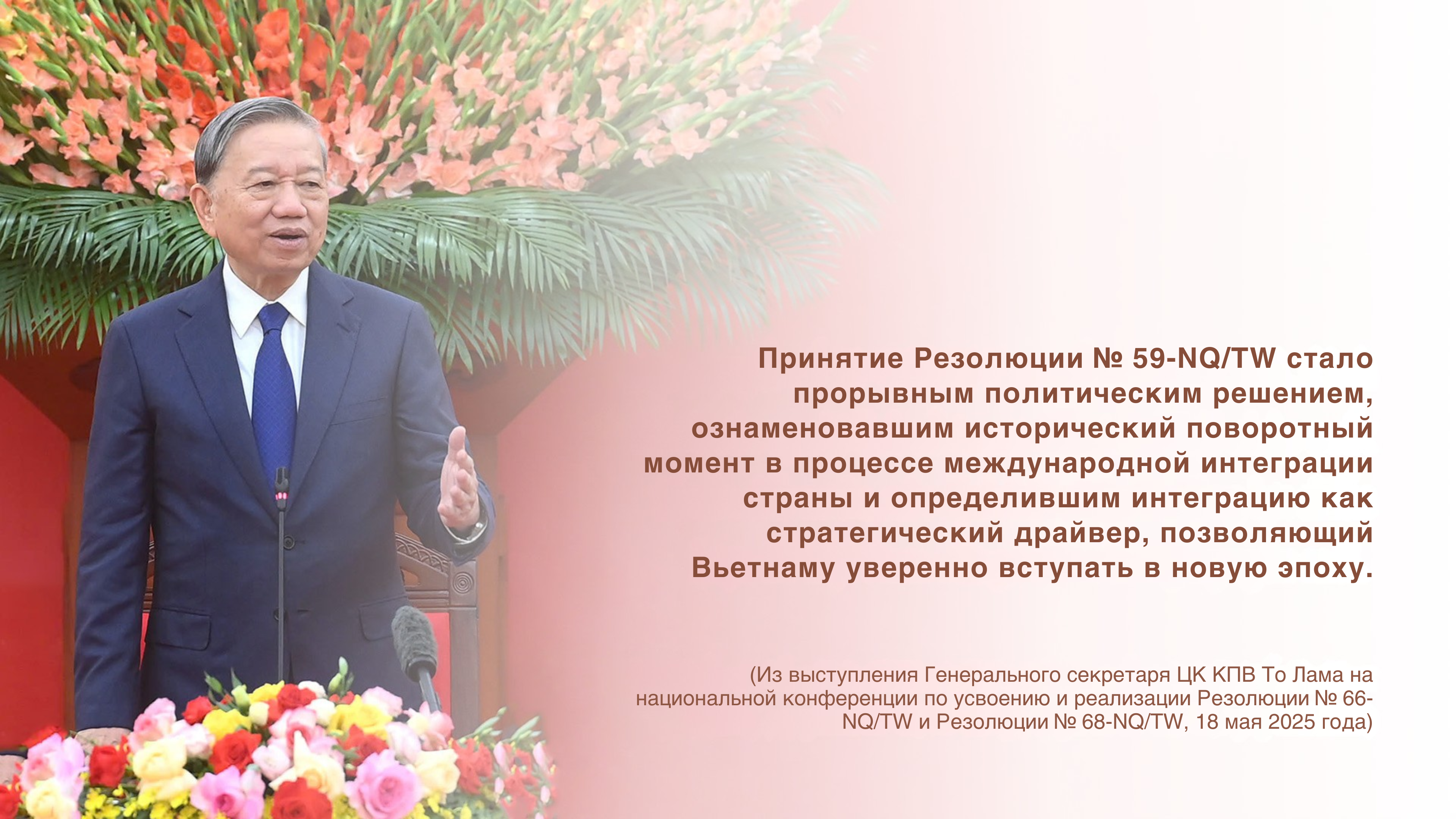 Принятие Резолюции № 59-NQ/TW стало прорывным политическим решением, ознаменовавшим исторический поворотный момент в процессе международной интеграции страны и определившим интеграцию как стратегический драйвер, позволяющий Вьетнаму уверенно вступать в новую эпоху. Последовательный подход Резолюции заключается в следующем: международная интеграция является делом всего народа под абсолютным, непосредственным и всесторонним руководством Партии, при едином управлении Государства, при этом человек и предприятия выступают центральным элементом и основным субъектом творческой деятельности.