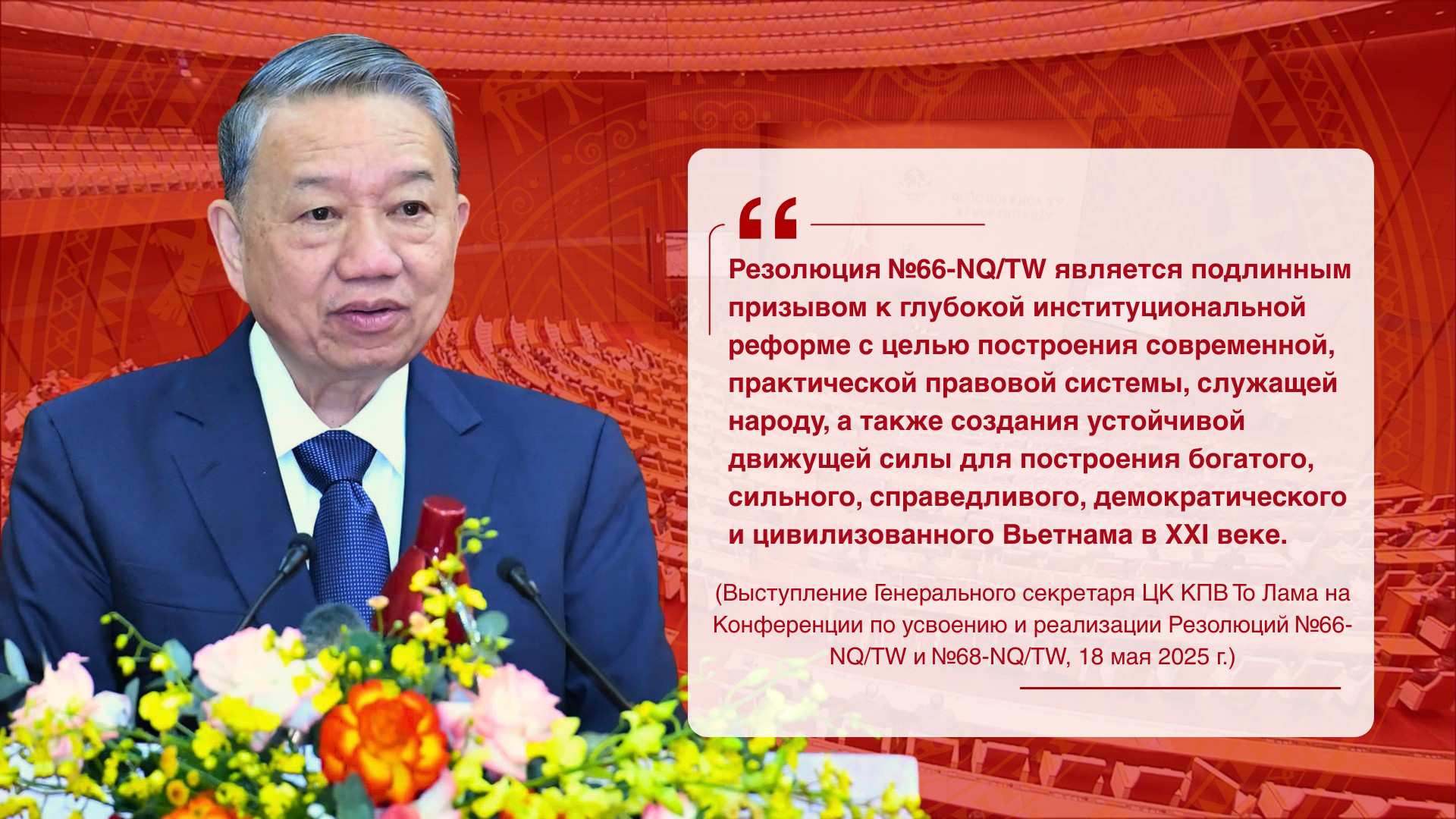 Обнародование Резолюции №66-NQ/TW является объективной необходимостью процесса обновления («Доймой»), направленной на совершение прорыва в повышении качества и эффективности работы по формированию и применению законодательства, что отвечает требованиям развития страны в новую эпоху ее подъема и продвижения к богатству и процветанию. Данная Резолюция является конкретизацией курса и руководящих установок Партии по строительству и совершенствованию социалистического правового вьетнамского Государства, принадлежащего народу, созданного народом и служащего народу, под руководством Партии.