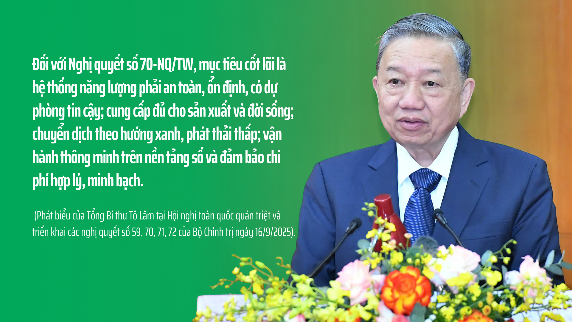Nghị quyết số 70-NQ/TW khẳng định an ninh năng lượng là trụ cột then chốt của an ninh quốc gia, gắn với phát triển kinh tế - xã hội bền vững, quốc phòng - an ninh, bảo vệ môi trường và nâng cao đời sống nhân dân. Nghị quyết đặt ra mục tiêu chiến lược rõ ràng, chuyển từ tư duy bảo đảm cung cấp năng lượng sang mô hình an ninh năng lượng chủ động, linh hoạt, đa dạng và bền vững, thúc đẩy phát triển năng lượng tái tạo, hiệu quả sử dụng năng lượng và thị trường năng lượng cạnh tranh, minh bạch nhằm đáp ứng yêu cầu phát triển nhanh và hội nhập sâu rộng trong kỷ nguyên mới.