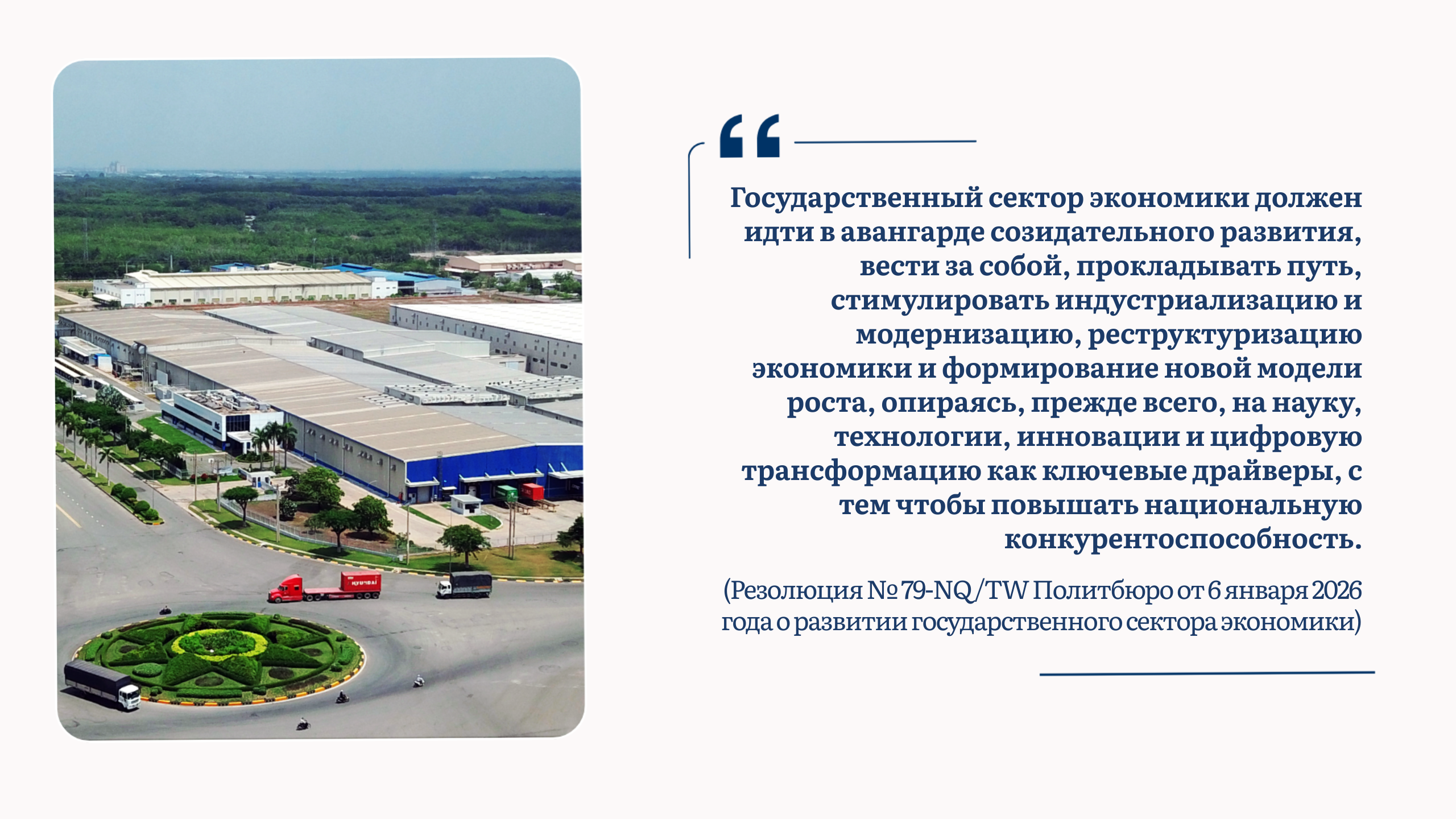 Повысить эффективность и развивать ведущую, пионерскую роль государственного сектора экономики в ключевых отраслях, направлять развитие других экономических секторов, содействовать превращению Вьетнама в развивающуюся страну с современной промышленностью к 2030 году и в развитую страну к 2045 году.