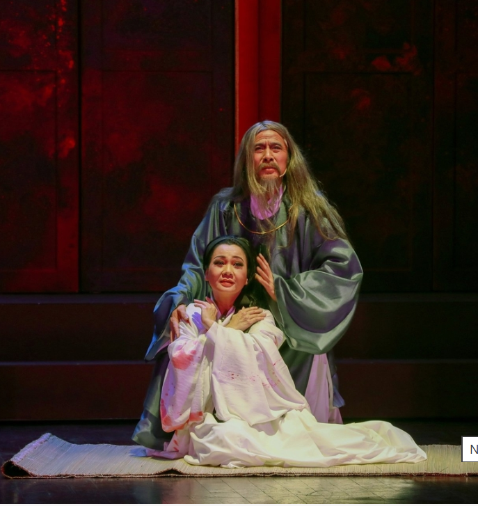 Nguyễn Trãi và Nguyễn Thị Lộ trong vở kịch "Lệ Chi Viên". (Ảnh: nongnghiepmoitruong.vn)