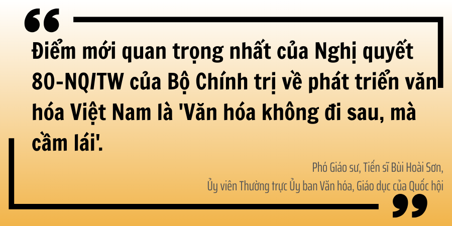 Đối với Phó Giáo sư, Tiến sĩ Bùi Hoài Sơn, điểm mới quan trọng nhất của Nghị quyết số 80-NQ/TW của Bộ Chính trị về phát triển văn hóa Việt Nam là “Văn hóa không đi sau, mà cầm lái”.