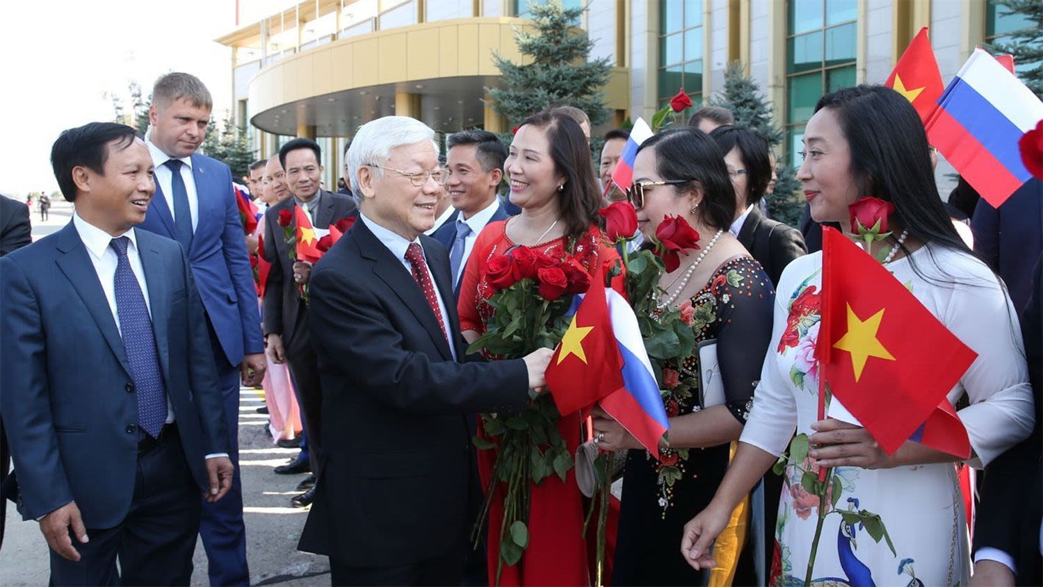 Cán bộ Đại sứ quán và đại diện cộng đồng người Việt Nam tại LB Nga đón Tổng Bí thư Nguyễn Phú Trọng.
