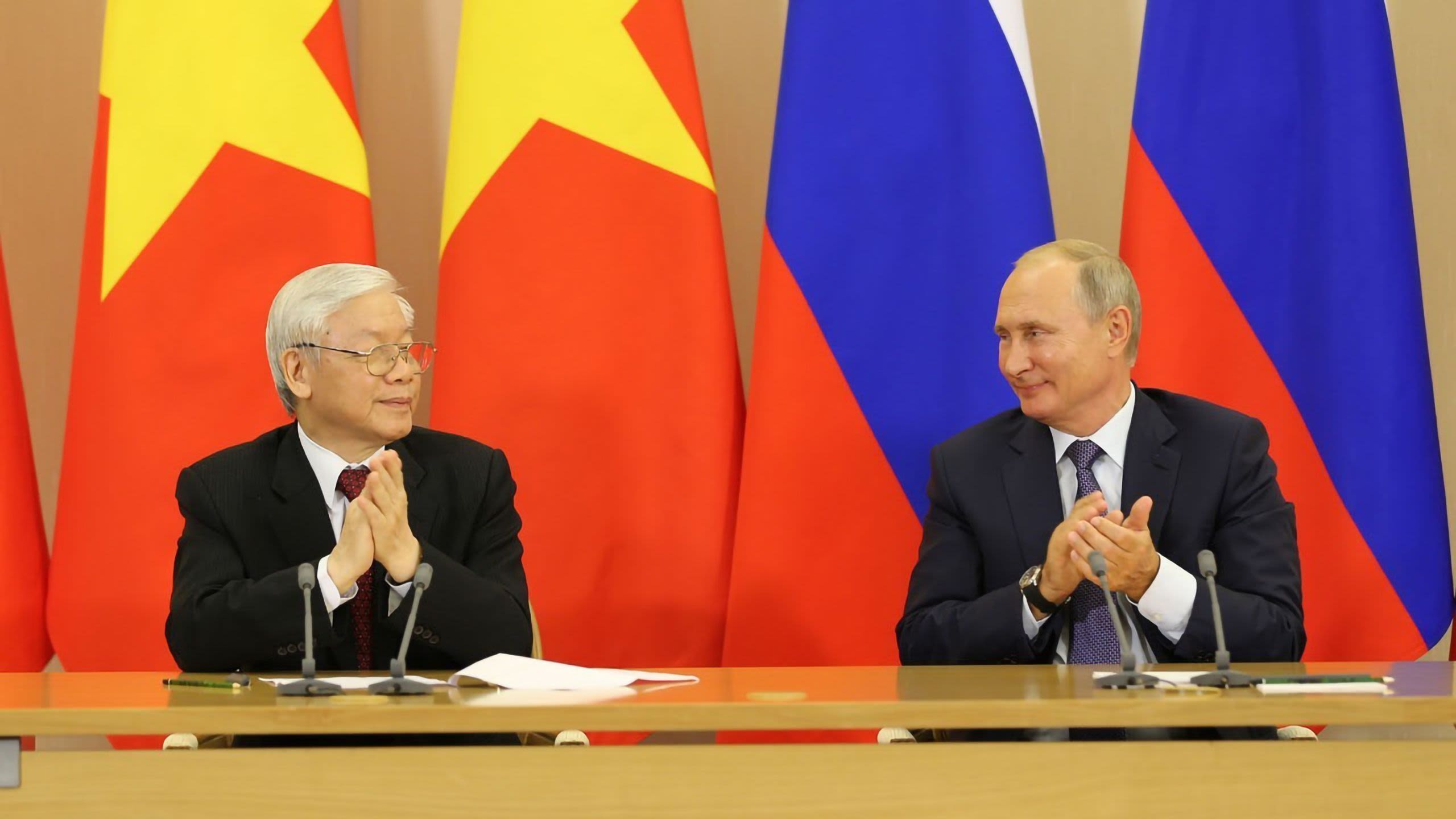 Tổng Bí thư Nguyễn Phú Trọng cùng Tổng thống Vladimir Putin gặp gỡ và phát biểu với báo chí sau hội đàm trong chuyến thăm LB Nga (năm 2018).