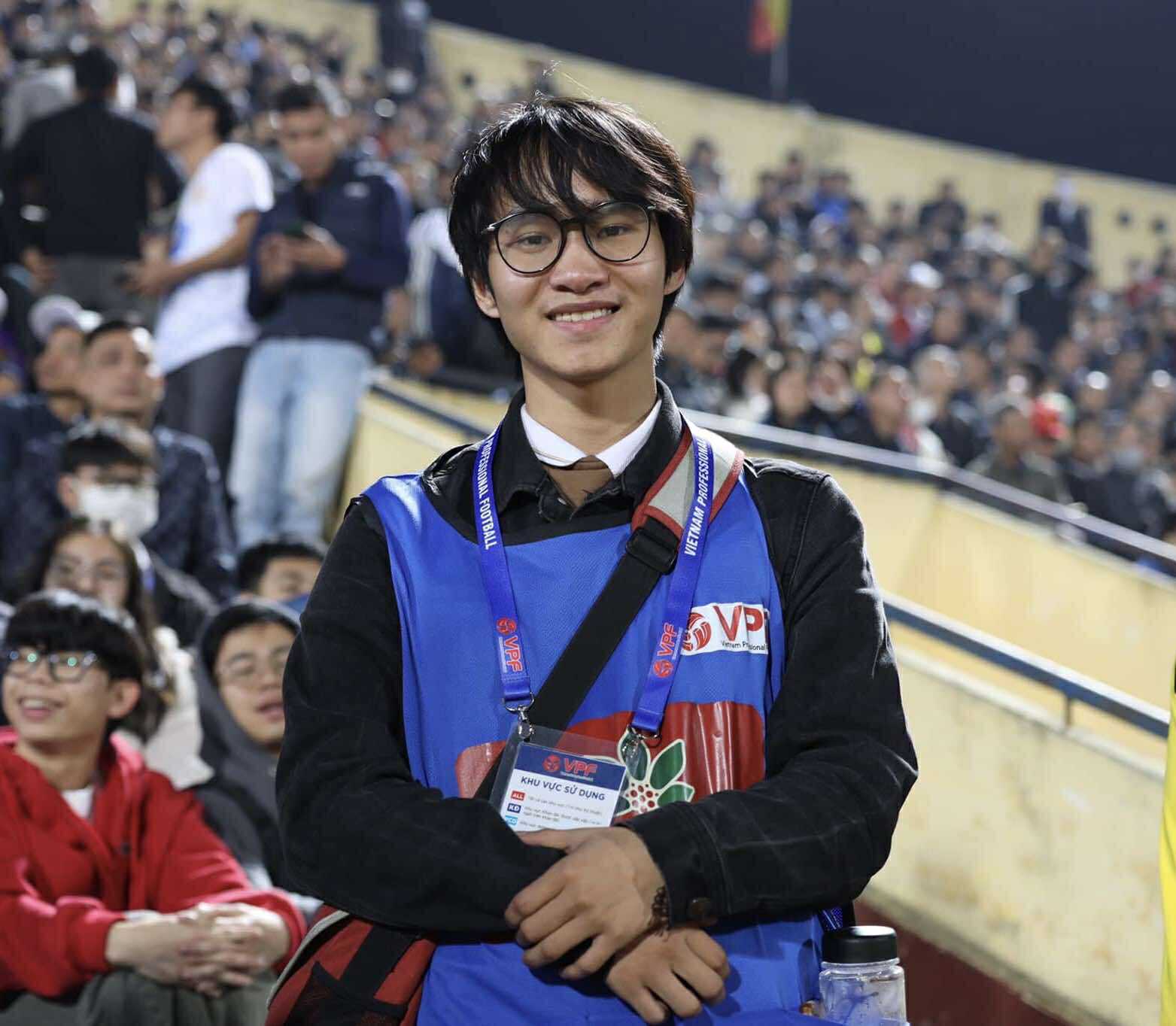 Le jeune journaliste Pham Xuan Thu en mission de couverture médiatique au stade Thien Truong, dans le cadre d’un reportage sportif. Photo fournie par lui-même.