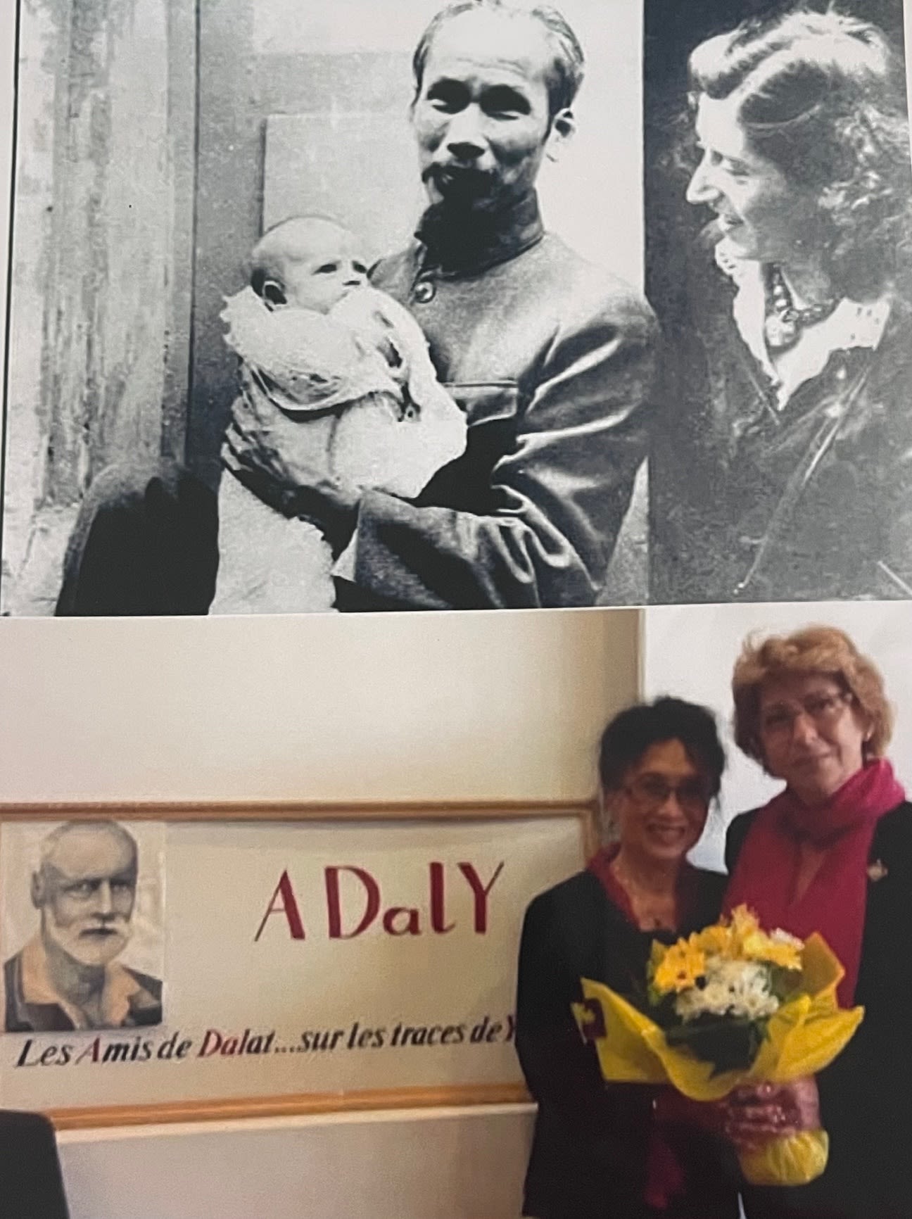 Mme Anna Richardson (à gauche) et Mme Elisabeth Aubrac (à droite), posent pour une photo souvenir au siège de l’Association des Amis de Da Lat (France), devant une photo historique accrochée au mur, montrant le président Ho Chi Minh tenant dans ses bras sa filleule française, Elisabeth enfant. À côté du Président figure Mme Lucie Aubrac, la mère d’Elisabeth Aubrac. Photo : Anna Richardson.
