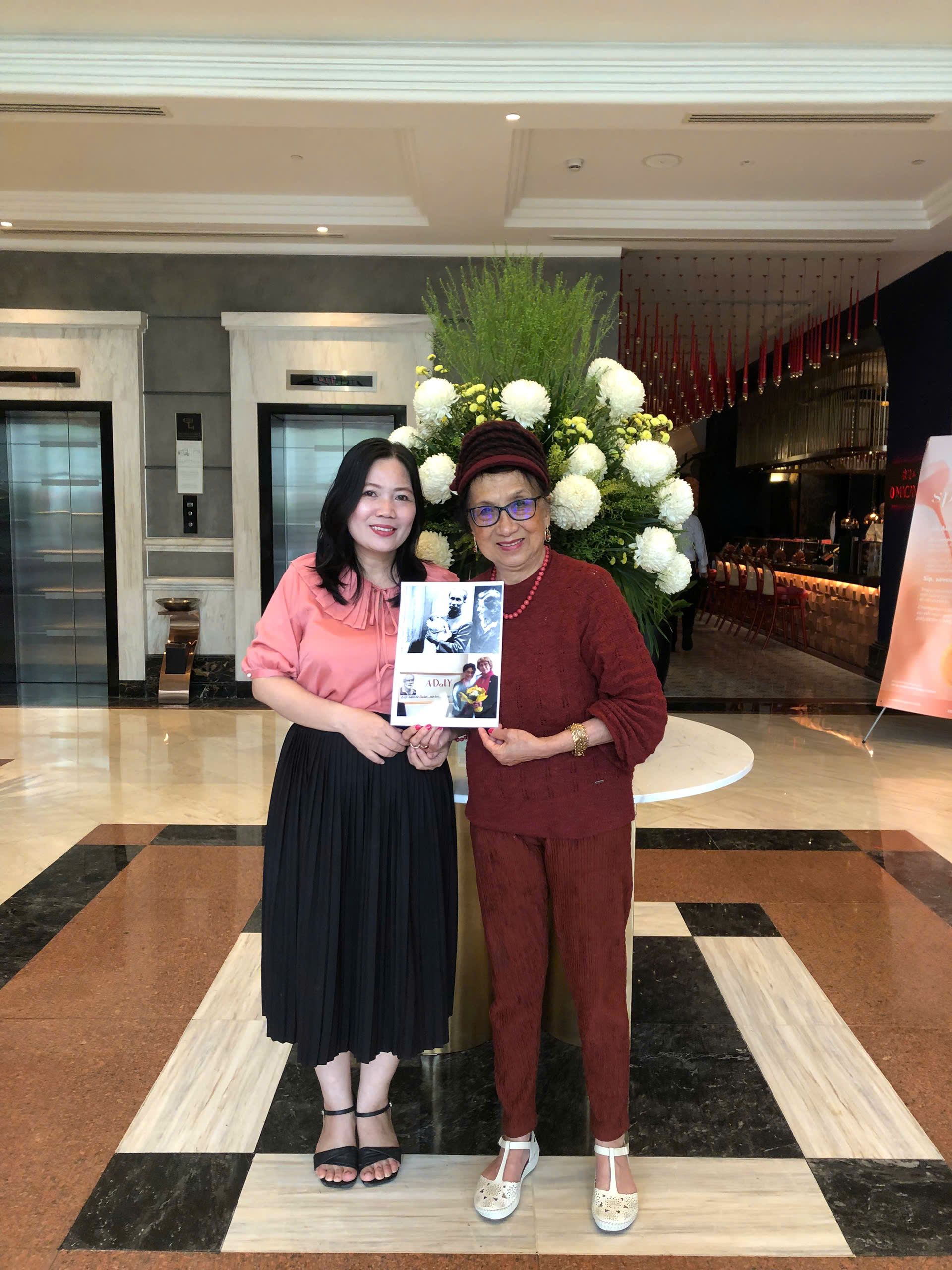 La journaliste Minh Hanh (à gauche) et Mme Anna Richardson (à droite) posent pour une photo souvenir à Hanoï. Mme Anna Richardson tient entre ses mains une reproduction d’une photo historique montrant le président Ho Chi Minh tenant dans ses bras sa filleule française, Élisabeth Aubrac enfant. À côté du président Ho Chi Minh se trouve Mme Lucie Aubrac, la mère d’Élisabeth Aubrac. Photo : Minh Hanh.