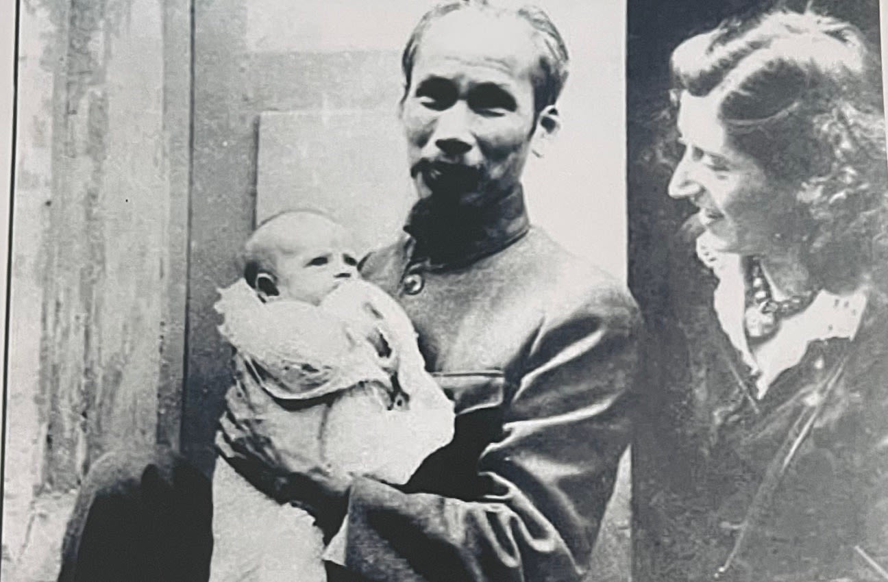 Le président Ho Chi Minh tenant dans ses bras sa filleule Elisabeth Aubrac. À ses côtés, Mme Lucie Aubrac. Photo fournie par Anna Richardson.