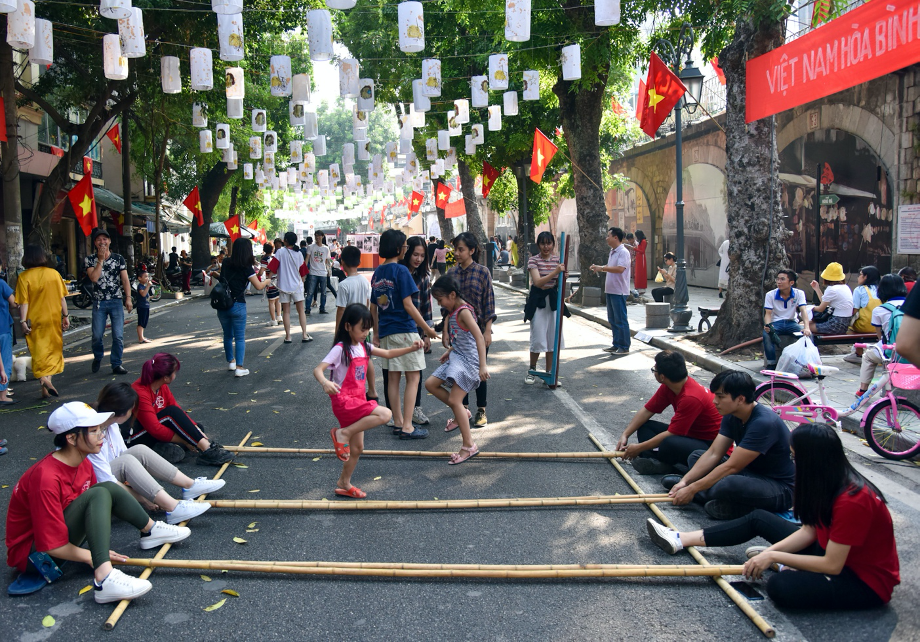 Người dân và du khách trải nghiệm các hoạt động văn hoá tại phố bích hoạ Phùng Hưng. (Ảnh Đăng Anh)