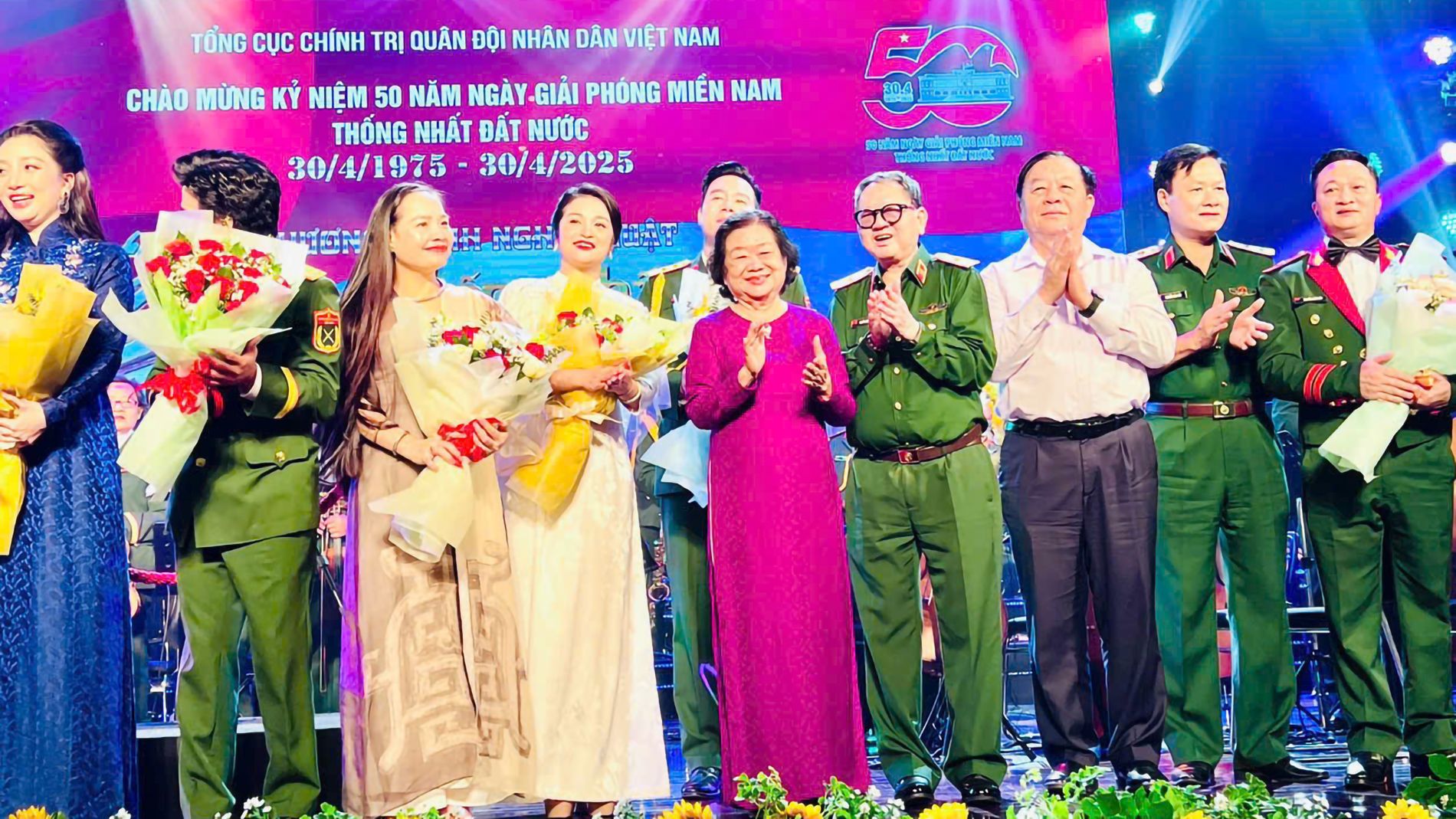 Bà Trương Mỹ Hoa tặng hoa cho các nghệ sĩ, diễn viên thuộc Tổng cục Chính trị-Quân đội nhân dân Việt Nam trong đêm nhạc kỷ niệm 50 năm Ngày Giải phóng miền nam, thống nhất đất nước. (Ảnh: Thu Hương)
