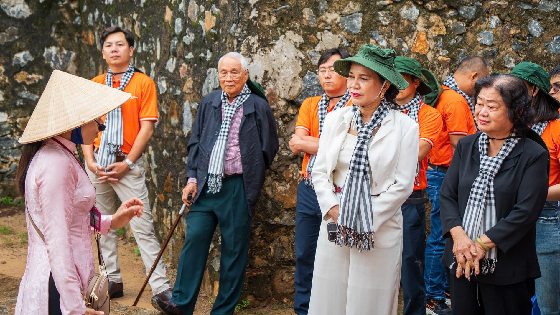 Cựu tù chính trị Trương Mỹ Hoa và đoàn công tác Quỹ Vừ A Dính thăm lại nhà tù Côn Đảo. (Ảnh: Thu Hương)
