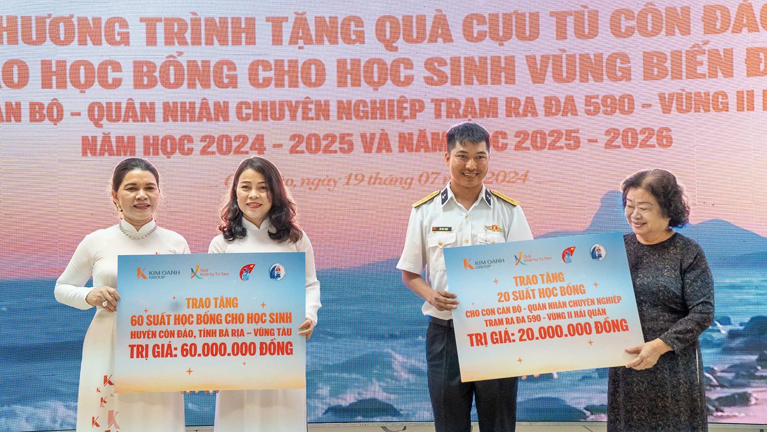 Nguyên Phó Chủ tịch nước Trương Mỹ Hoa trao tặng quà cho các cựu tù Côn Đảo và trao học bổng cho học sinh là con em cán bộ-quân nhân chuyên nghiệp Vùng 2 Hải quân. (Ảnh: Thu Hương)