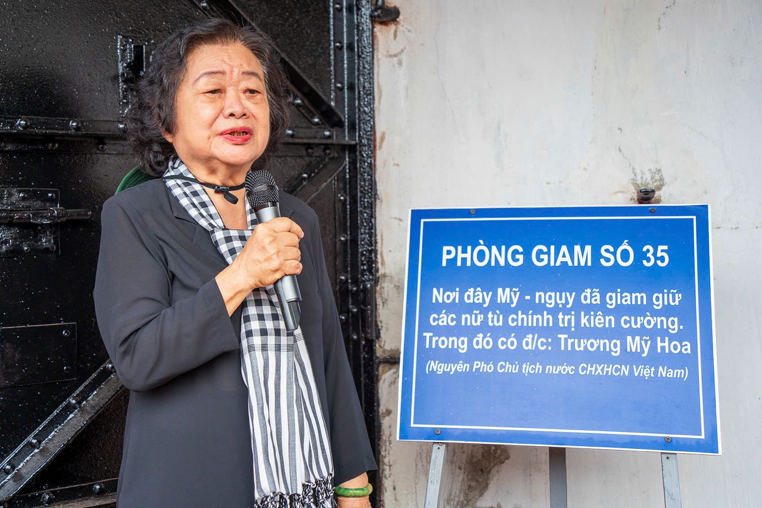 Nguyên Phó Chủ tịch nước Trương Mỹ Hoa chia sẻ với các thành viên Quỹ Vừ A Dính trước phòng giam nơi bà đã từng bị tù đày. (Ảnh: Thu Hương)