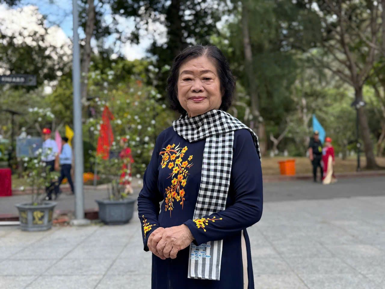 Bà Trương Mỹ Hoa về thăm đồng đội tại Nghĩa trang Hàng Dương, tháng 4/2025. (Ảnh: Thu Hương)