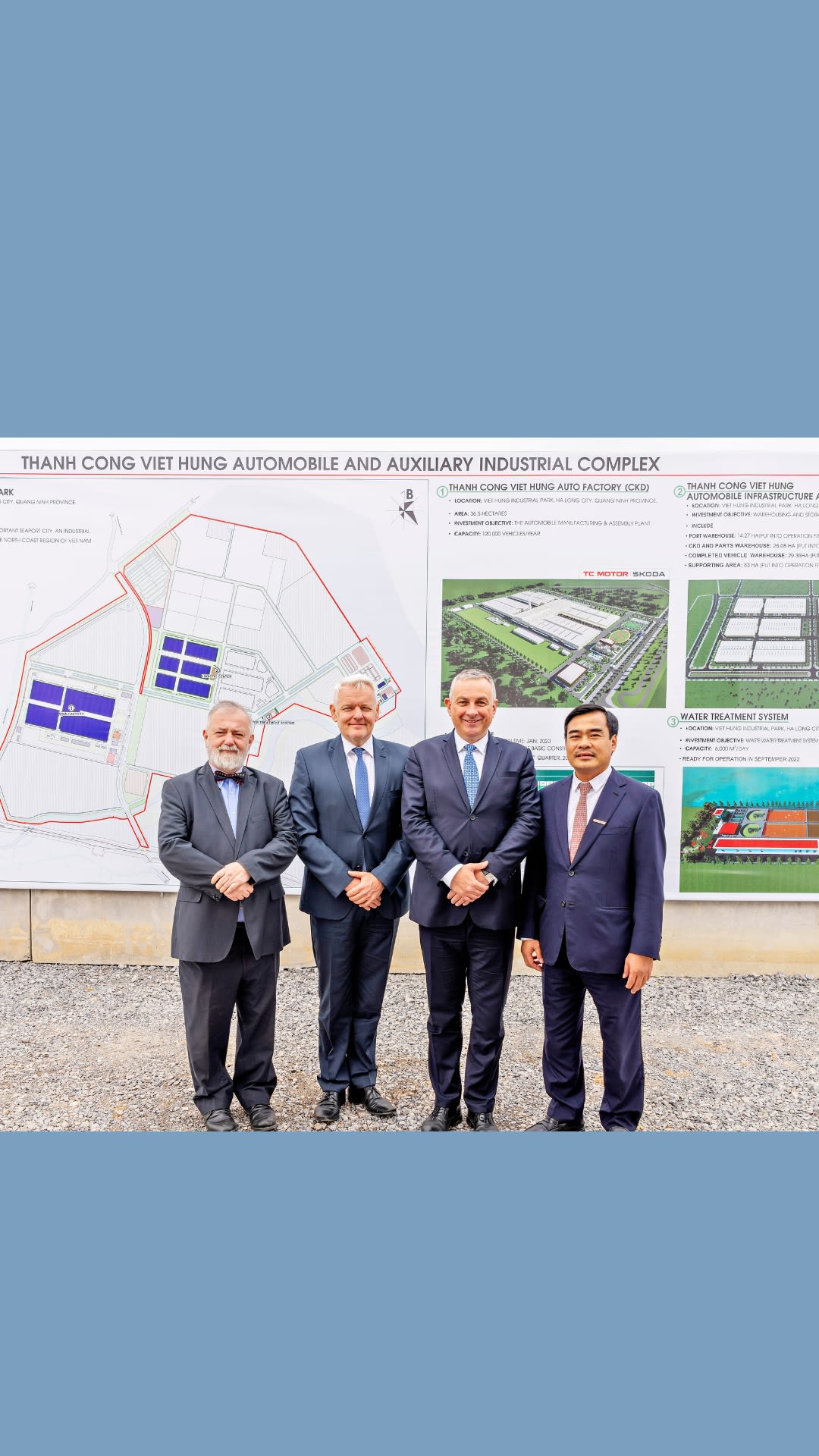 Trong tháng 2 và tháng 4/2023, Bộ trưởng Công thương Séc và Thủ tướng Cộng hòa Séc đã tới thăm và khảo sát tiến độ xây dựng nhà máy. Các vị lãnh đạo cấp cao của Cộng hòa Séc đều bày tỏ sự ủng hộ và vui mừng trước mối quan hệ hợp tác giữa hai tập đoàn công nghiệp hàng đầu của hai quốc gia. Thủ tướng Cộng hòa Séc Petr Fiala thể hiện sự quan tâm, tạo điều kiện và ủng hộ để các kế hoạch triển khai chi tiết giữa hai bên diễn ra thuận lợi, hiệu quả nhằm đưa thương hiệu xe hơi lâu đời của Cộng hòa Séc sớm ra mắt tại Việt Nam.