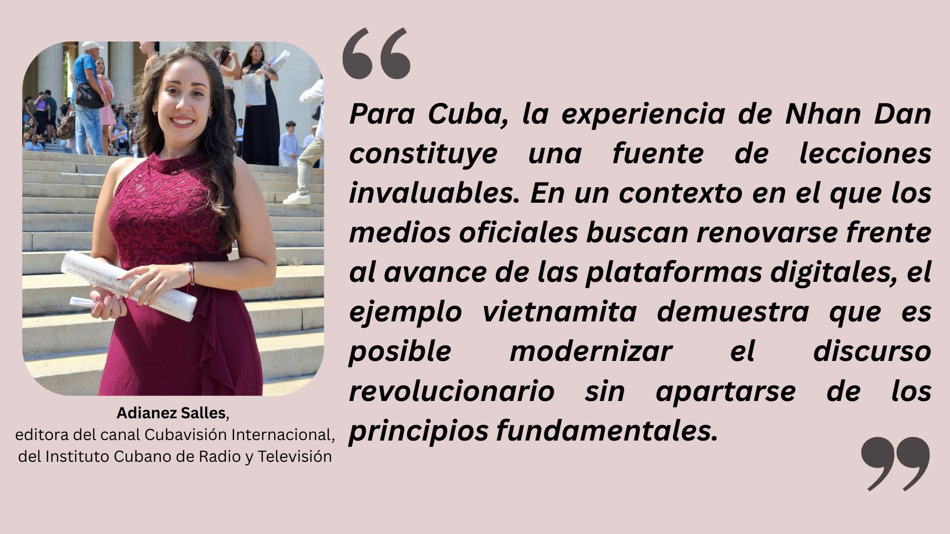 La joven periodista considera que, más allá de ofrecer una experiencia interesante al público, el periodismo debe buscar siempre nuevas formas de difundir los valores históricos y de alimentar el patriotismo en una sociedad cada vez más digitalizada. "Para Cuba, la experiencia de Nhan Dan constituye una fuente de lecciones invaluables. En un contexto en el que los medios oficiales buscan renovarse frente al avance de las plataformas digitales, el ejemplo vietnamita demuestra que es posible modernizar el discurso revolucionario sin apartarse de los principios fundamentales", afirmó.