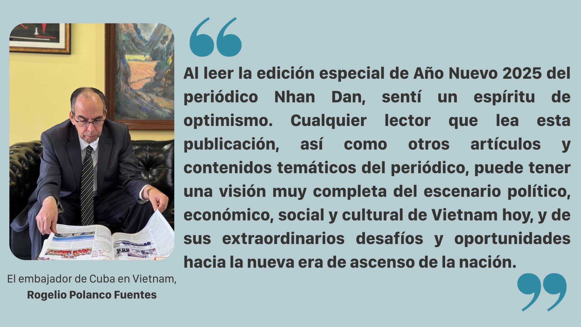 Una mañana de fines de 2024, Año del Dragón, mientras Hanói se preparaba con entusiasmo para recibir el año de la Serpiente 2025, el embajador de Cuba acogió amigablemente al reportero del periódico Nhan Dan en la sede de la embajada. Como exeditor en jefe del diario Juventud Rebelde y panelista y presentador del programa Mesa Redonda Informativa de la Televisión Cubana, el embajador cubano tiene un profundo conocimiento del papel de la prensa revolucionaria en la vida política y social tanto de Vietnam como de Cuba.