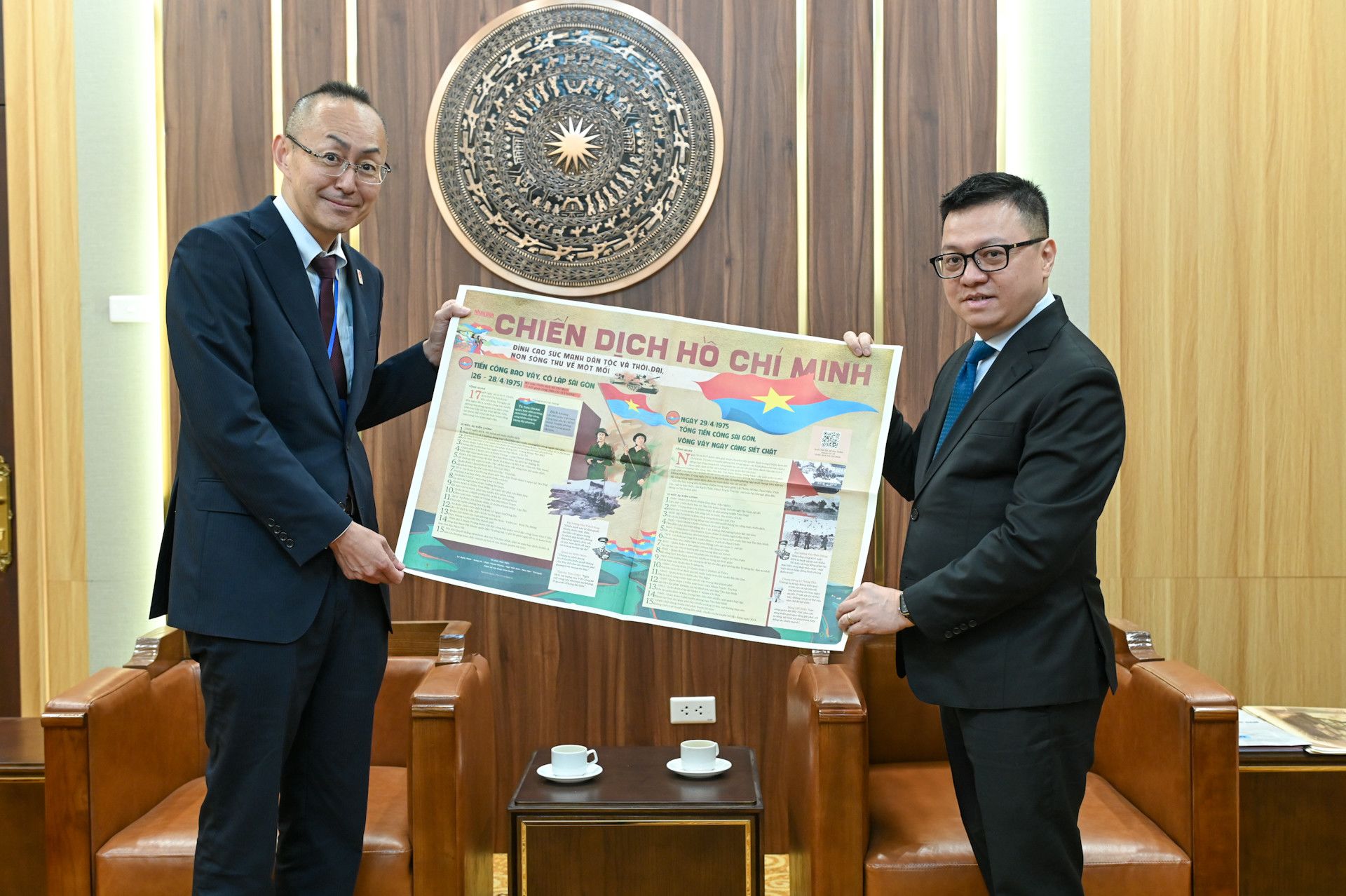 Editor-in-Chief of Nhan Dan Newspaper Le Quoc Minh presents the special supplement published by Nhan Dan to commemorate the 50th anniversary of the Liberation of the South and National Reunification to the delegation of the Japan International Cooperation Agency (JICA).