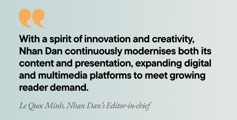 In particular, Nhan Dan has partnered with international collaborators to incorporate the Shorthand platform into the production of E-magazine and longform stories. The newspaper is also actively expanding its presence on social media platforms such as Facebook, YouTube, and TikTok. With a focus on accuracy, speed, compelling storytelling, and modern presentation, the Nhan Dan fanpages deliver hundreds of high-quality products each day from across the newspaper's publications, using customised layouts to suit each content type.