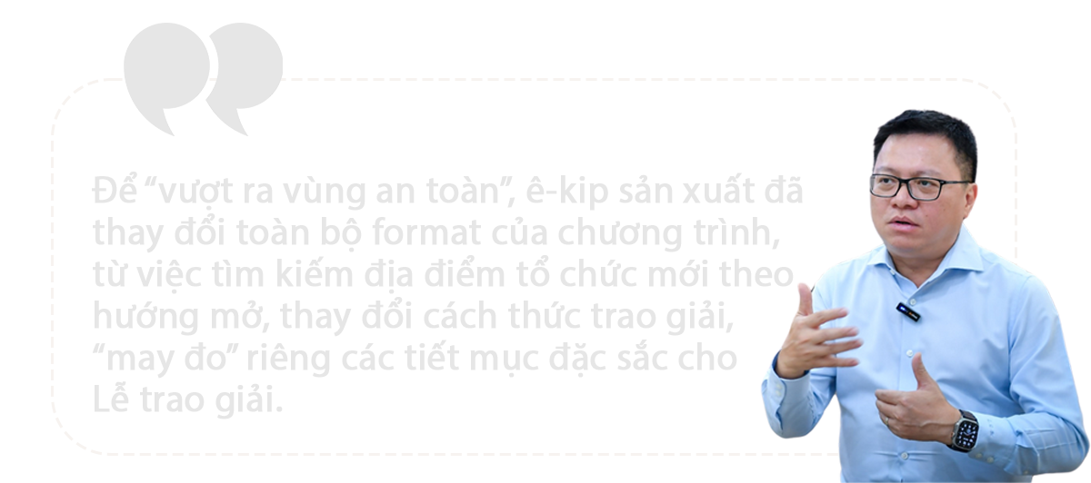 Để “vượt ra vùng an toàn”, ê-kip sản xuất đã thay đổi toàn bộ format của chương trình, từ việc tìm kiếm địa điểm tổ chức mới theo hướng mở, thay đổi cách thức trao giải, “may đo” riêng các tiết mục đặc sắc cho lễ trao giải.