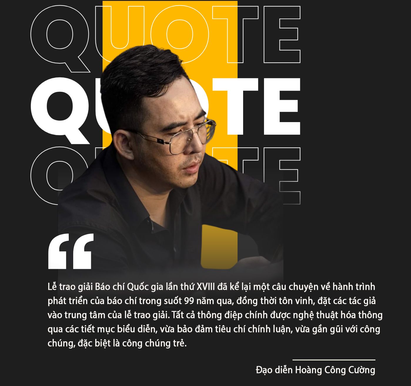 “Đặt các nhà báo vào vị trí trung tâm, Ban tổ chức cũng xác định, mỗi phần trao giải sẽ có cách thức khác nhau. Thí dụ như phần trao giải B, trên sân khấu xuất hiện một bông sen nở ra tháp bút, tượng trưng cho cội nguồn tinh hoa của dân tộc. Tới phần trao giải A, mỗi tác giả/nhóm tác giả đều xuất hiện với tên tác phẩm của riêng mình. Họ đứng trên sân khấu như những ngôi sao danh vọng, tỏa sáng”, đạo diễn Hoàng Công Cường chia sẻ.