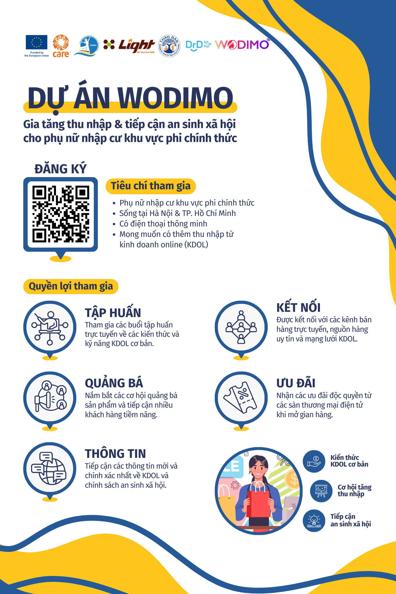 Bên cạnh đó, nhiều dự án cộng đồng cũng đã được triển khai, đóng vai trò quan trọng trong việc nâng cao chất lượng sống cho người lao động di cư. Nổi bật trong số đó là dự án WODIMO - một dự án được Liên minh châu Âu tài trợ, tổ chức CARE quốc tế tại Việt Nam và Trung tâm Giáo dục nghề nghiệp và Hỗ trợ phát triển phụ nữ Hà Nội (CEWDS) thực hiện. Đây là dự án hỗ trợ phụ nữ lao động di cư, đặc biệt trong lĩnh vực phi chính thức ứng dụng công nghệ số để mở ra cơ hội việc làm và cải thiện khả năng tiếp cận các dịch vụ an sinh xã hội. Dự án không chỉ cung cấp thông tin hữu ích về các chính sách an sinh xã hội mà còn tổ chức các chương trình đào tạo nhằm nâng cao năng lực cho chị em phụ nữ di cư. Qua đó, các chị em có thể tham gia vào các hoạt động kinh doanh trực tuyến an toàn, hiệu quả và đúng pháp luật, giúp gia tăng thu nhập và ổn định cuộc sống. Quan trọng hơn, dự án còn giúp người lao động di cư hiểu rõ về quyền lợi và nghĩa vụ của mình, từ đó biết cách tận dụng tốt hơn các dịch vụ xã hội.
