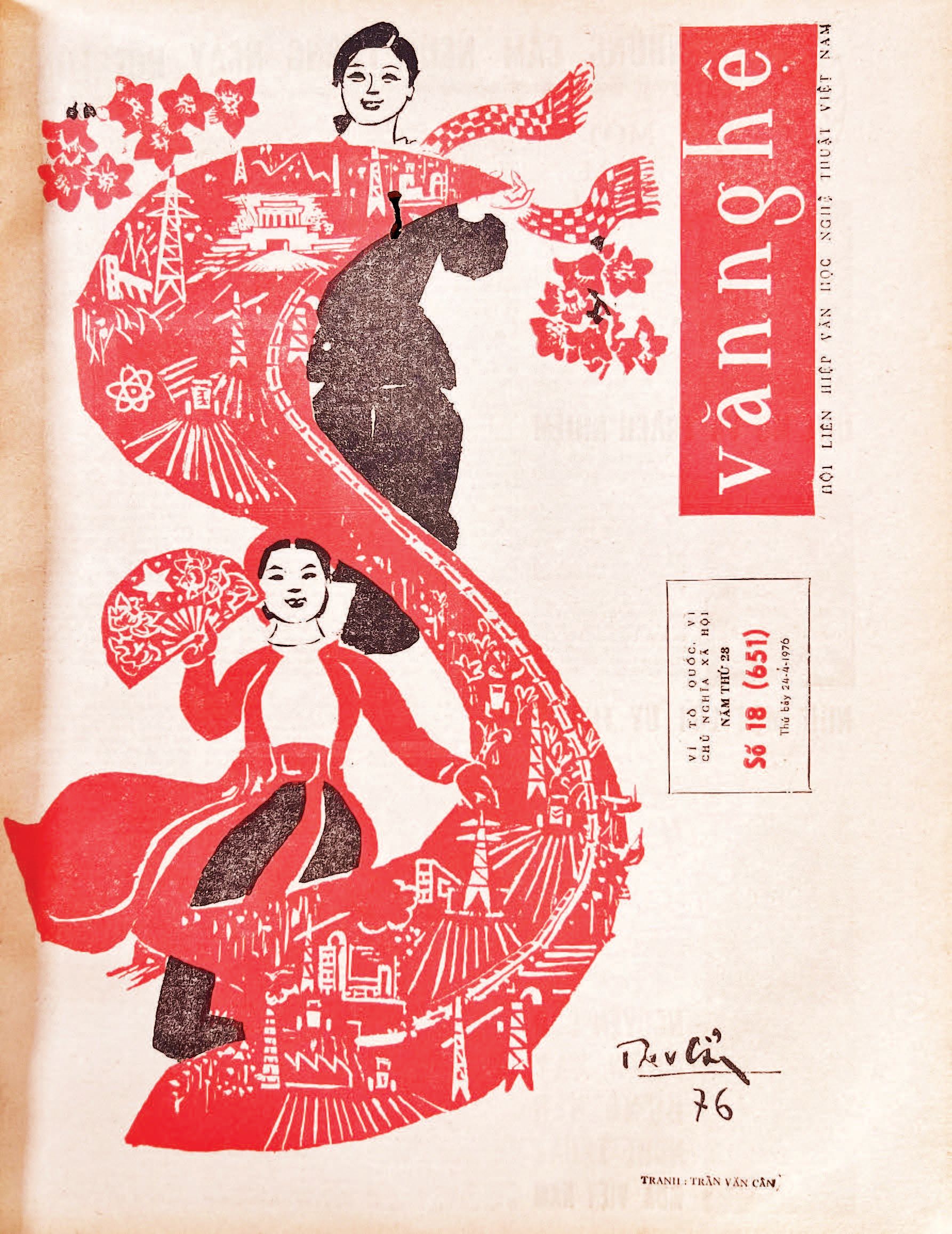 Trang nhất, báo Văn nghệ, số 18, ra ngày 24/4/1976 với bức tranh về niềm vui thống nhất đất nước của họa sĩ Trần Văn Cẩn.