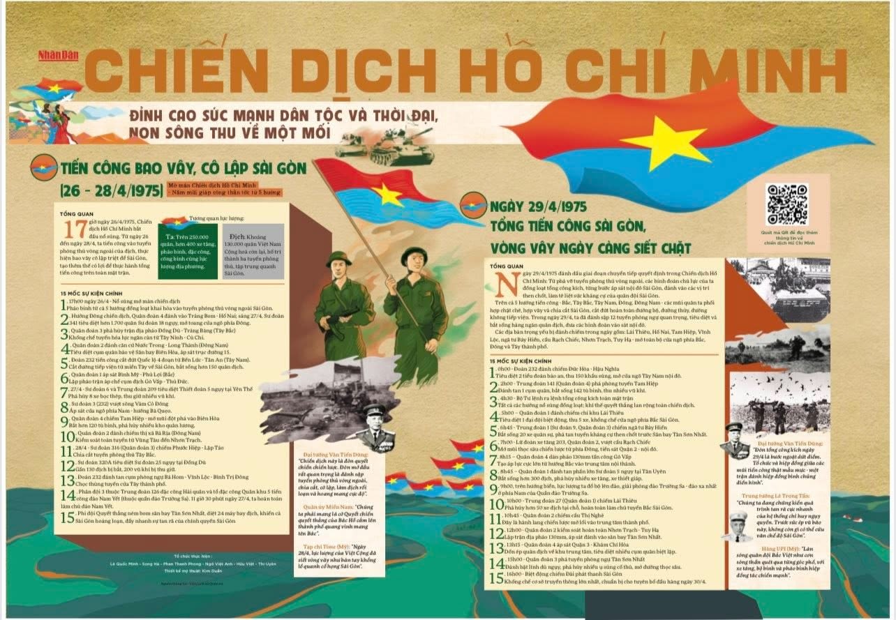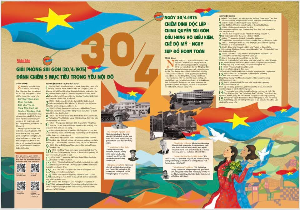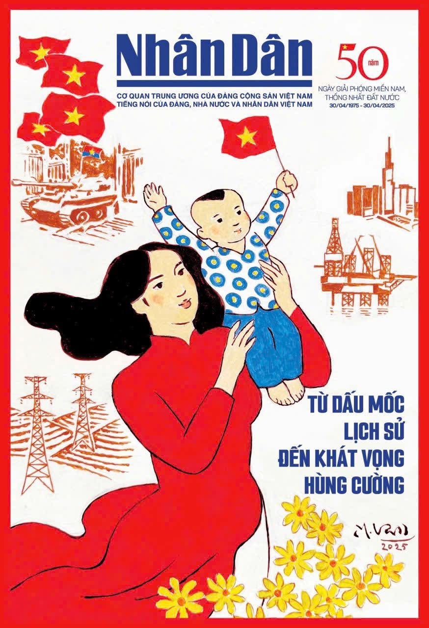 Trang bìa Số báo Đặc biệt của Báo Nhân Dân kỷ niệm 50 năm Ngày giải phóng miền nam thống nhất đất nước. Tranh bìa: Họa sĩ Lê Anh Vân.