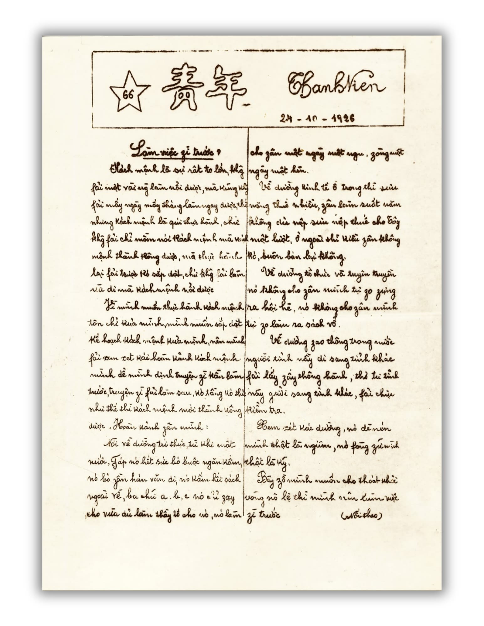Ta có thể cùng một lần mở lại trang báo Thanh Niên của những ngày tháng 6/1925, hoàn toàn chỉ có chữ viết tay, cả manchette tờ báo cũng được viết tay với ba phần nội dung đặt trong khung hình chữ nhật ở đầu trang nhất, từ trái sang phải: Hình ngôi sao, từ “Thanh Niên” bằng chữ Hán, từ “Thanh Niên” bằng chữ quốc ngữ. Nét bút thanh thoát mà chân phương.