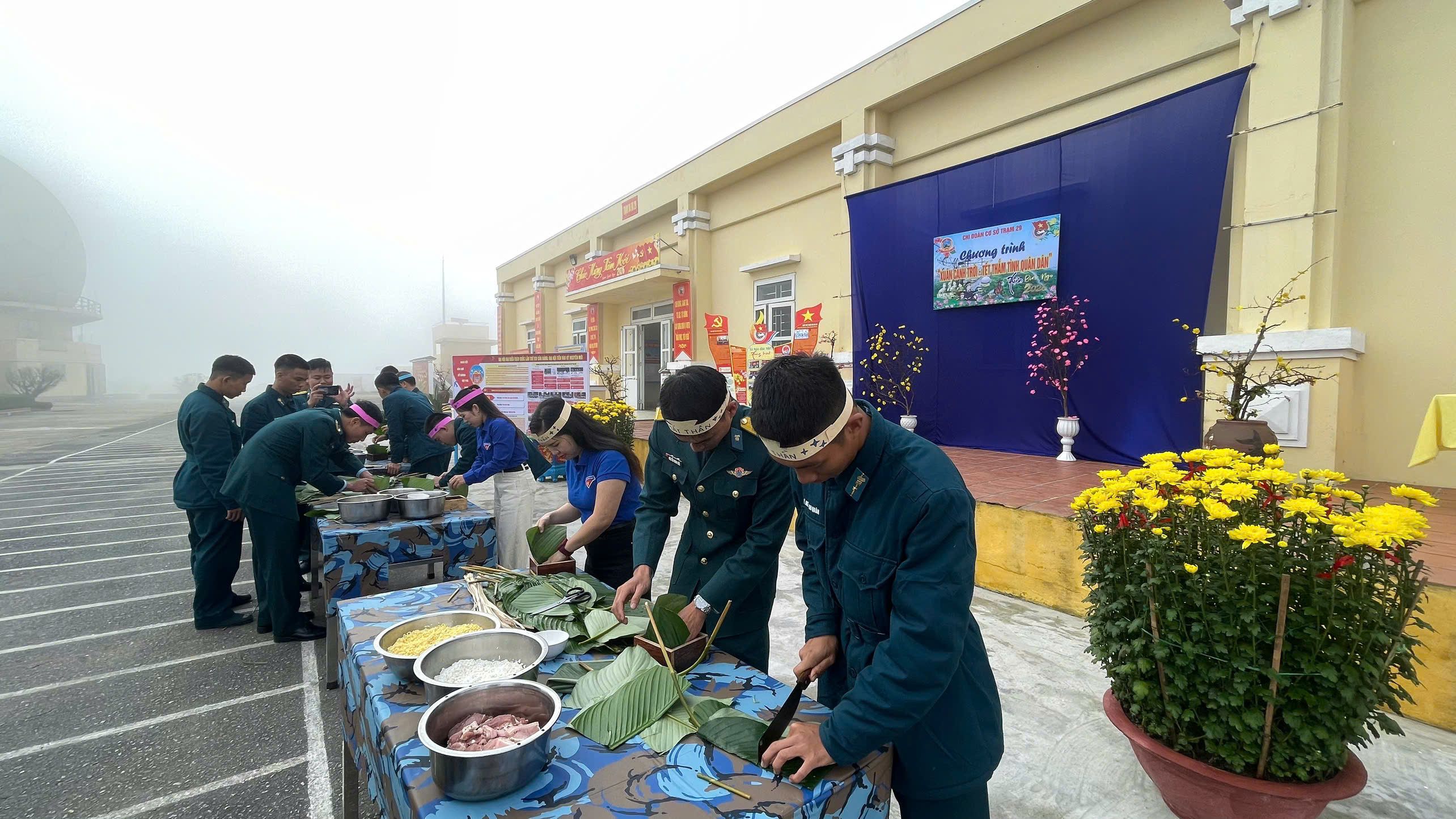 Cán bộ chiến sĩ Trạm Ra-đa 29 thuộc Trung đoàn Ra-đa 290, Sư đoàn 375 (Quân chủng Phòng không-Không quân) gói bánh thi trong chương trình " Xuân canh trời - Tết ấm tình quân dân".