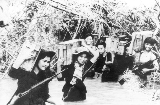Dân quân tải đạn, phục vụ chiến dịch trong kháng chiến chống Mỹ cứu nước.