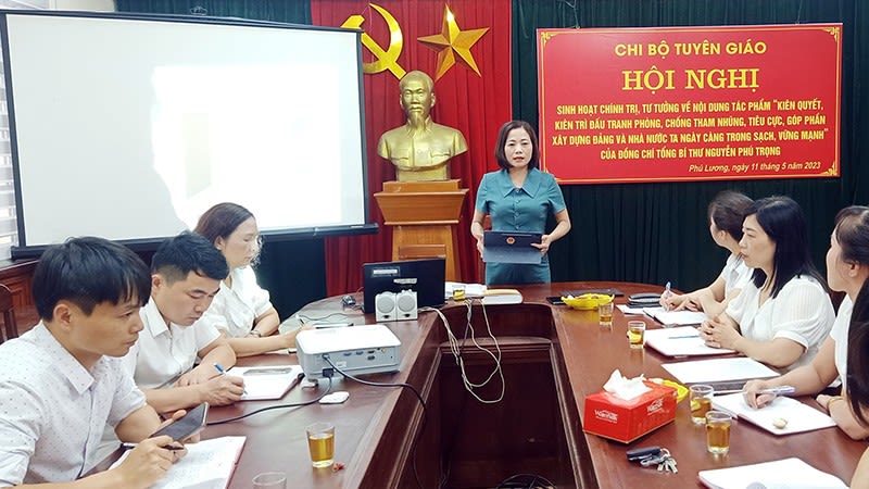 Hội nghị sinh hoạt chính trị, tư tưởng về tác phẩm "Kiên quyết, kiên trì đấu tranh phòng, chống tham nhũng, tiêu cực, góp phần xây dựng Ðảng và Nhà nước ta ngày càng trong sạch, vững mạnh" tại Chi bộ Tuyên giáo, huyện Phú Lương, tỉnh Thái Nguyên. Ảnh: ÐỨC THUẬN