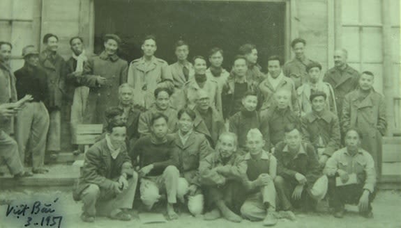 Nhà báo Nguyễn Khắc Tiếp (người đứng thứ 7 từ trái sang) chụp ảnh cùng Bác Hồ tại Chiến khu Việt Bắc năm 1951. (Ảnh do nhân vật cung cấp)