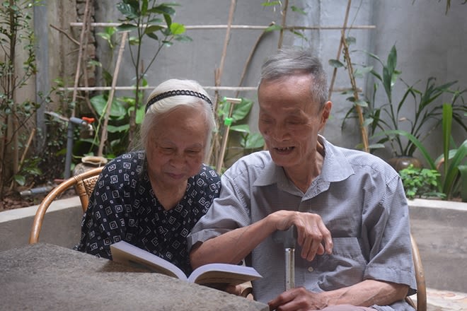 Nhà báo đại tá Nguyễn Khắc Tiếp bên người vợ đã bước sang tuổi 85. (Ảnh: cand.com.vn)