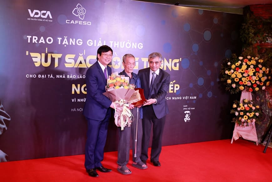 Lãnh đạo Hội Truyền thông số Việt Nam và nhà báo Hồ Quang Lợi, nguyên Phó chủ tịch Thường trực Hội Nhà báo Việt Nam trao phần thưởng tặng Đại tá, nhà báo Nguyễn Khắc Tiếp, ngày 15/4/2022. (Ảnh: qdnd.vn)