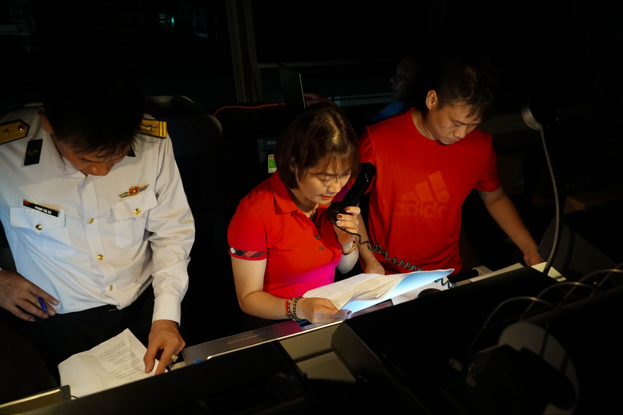 Nhà báo Thu Lan tác nghiệp bản tin trên tàu