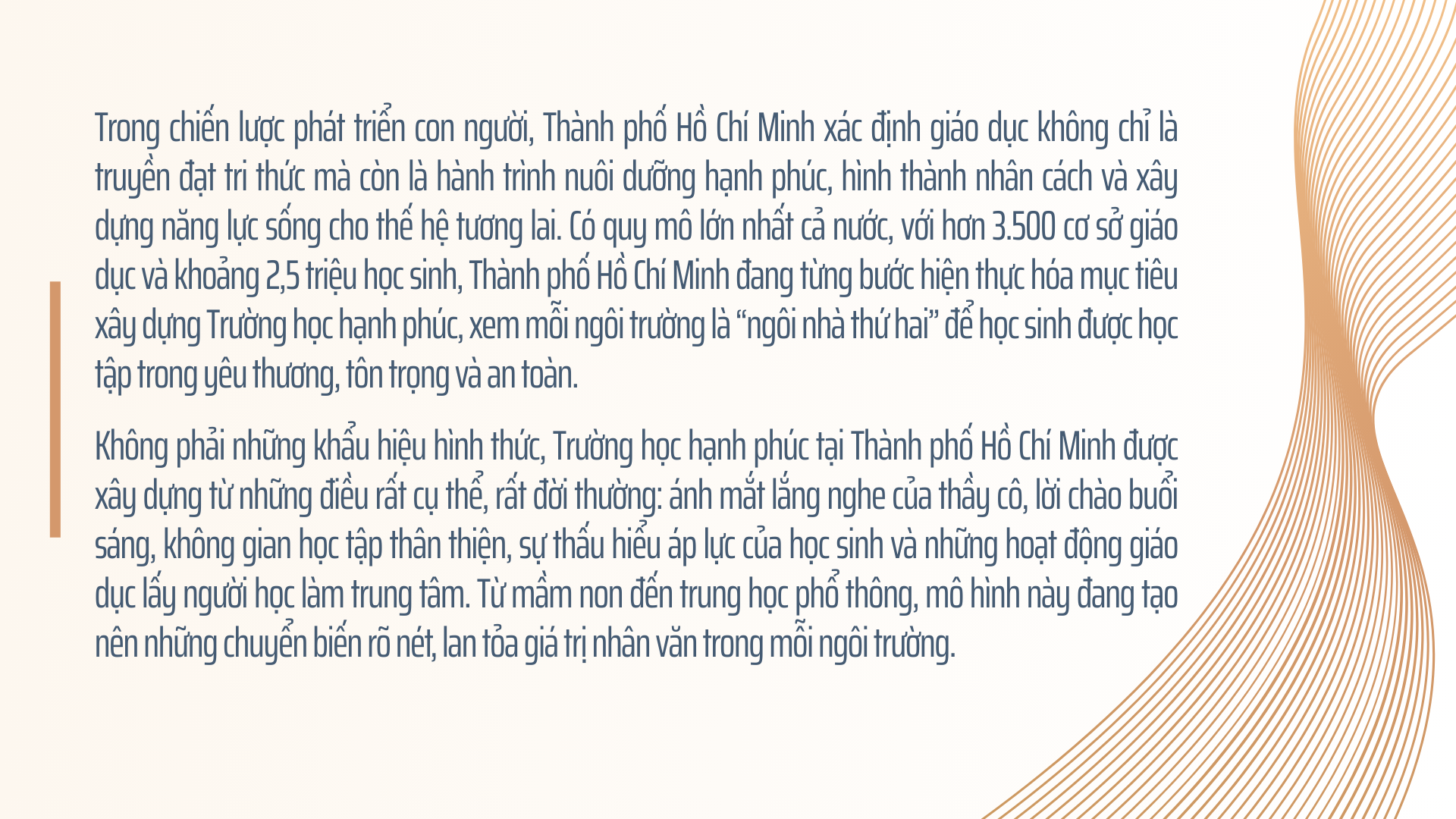 Xây dựng Trường học hạnh phúc không phải là đích đến trong ngày một ngày hai, mà là hành trình lâu dài đòi hỏi sự thay đổi từ thầy cô, học sinh, phụ huynh và toàn xã hội. Với quy mô dân số lớn, tốc độ đô thị hóa nhanh và nhiều áp lực xã hội, Thành phố Hồ Chí Minh càng cần những ngôi trường thực sự hạnh phúc để làm điểm tựa tinh thần cho thế hệ trẻ.