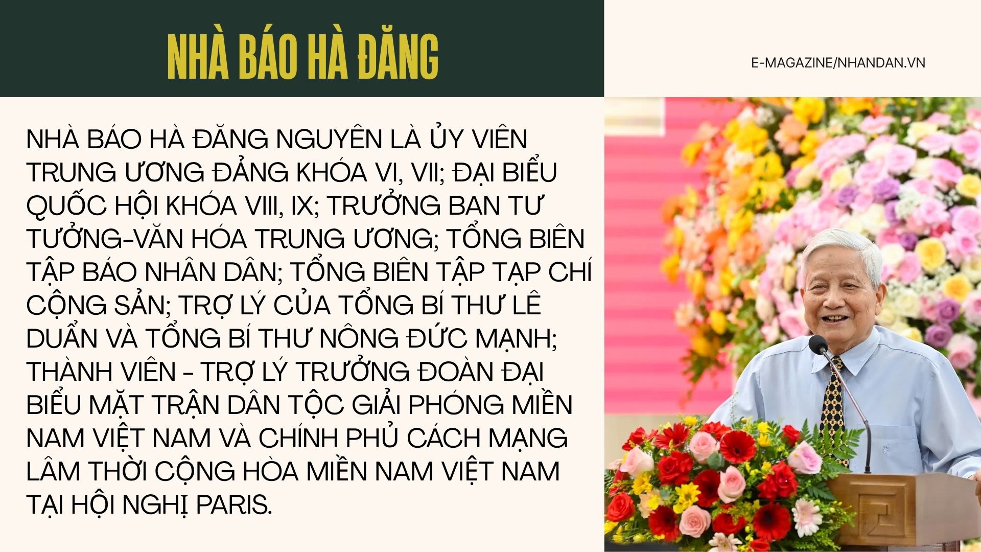 Trong sự nghiệp báo chí đồ sộ của mình, nhà báo Hà Đăng có nhiều bài viết mang tầm ảnh hưởng sâu rộng. Ngày 9/1/1961, bài viết “Ba lần đuổi kịp trung nông” được đăng trên Báo Nhân Dân.