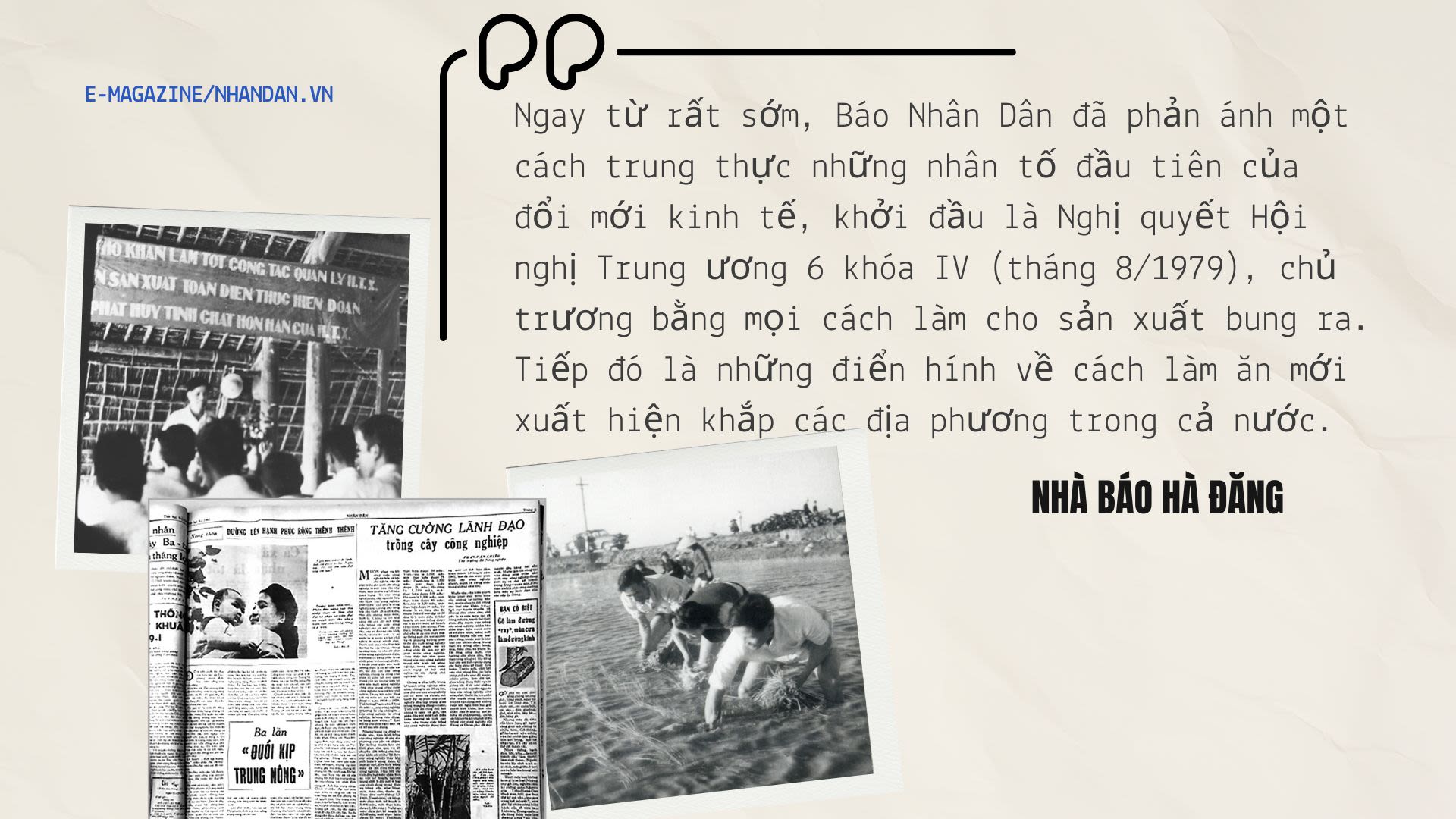 Xác định vai trò, bổn phận, trách nhiệm của nhà báo, của đội ngũ báo chí, các cơ quan báo chí với sự nghiệp Đổi mới, trong bài trên Nhân Dân cuối tuần ngày 21/6/2015, dịp kỷ niệm 90 năm Ngày Báo chí Cách mạng Việt Nam, nhà báo Hà Đăng viết: “Ngay từ rất sớm, Báo Nhân Dân đã phản ánh một cách trung thực những nhân tố đầu tiên của đổi mới kinh tế, khởi đầu là Nghị quyết Hội nghị Trung ương 6 khóa IV (tháng 8/1979), chủ trương bằng mọi cách làm cho sản xuất bung ra. Tiếp đó là những điển hình về cách làm ăn mới xuất hiện khắp các địa phương trong cả nước. Long An thí điểm mô hình “mua cao, bán cao”, “bù giá vào lương” thay cho cơ chế “mua cung, bán cấp”. Hải Phòng, Vĩnh Phú, Nghệ Tĩnh thí điểm hình thức khoán. Từ thực tiễn sống động, Chỉ thị số 100-CT/TW (ngày 13/1/1981) của Ban Bí thư về cải tiến công tác khoán, mở rộng khoán sản phẩm đến nhóm và người lao động trong hợp tác xã nông nghiệp ra đời”.