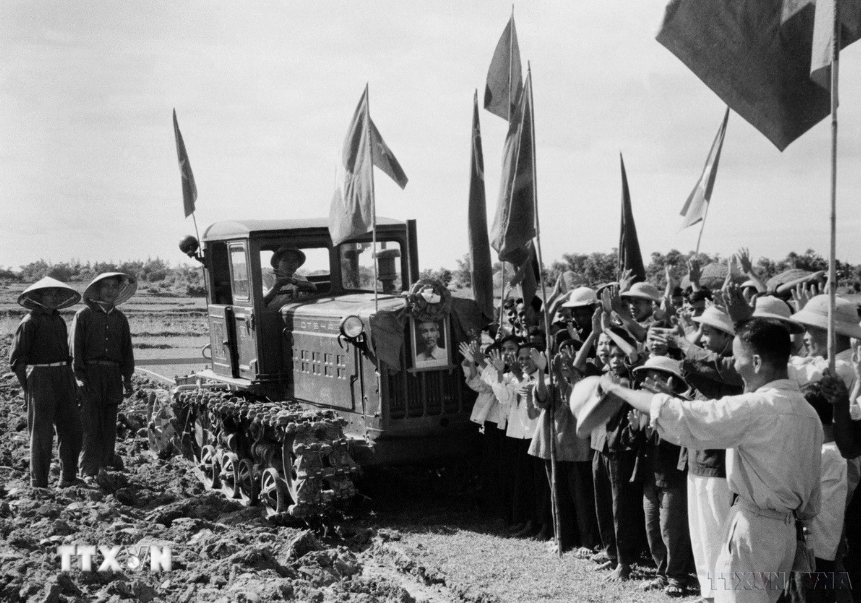 Chiếc máy cày của Chủ tịch Hồ Chí Minh tặng Hợp tác xã Đại Phong thực hiện luống cày đầu tiên (tháng 6/1961) trước sự vui mừng của bà con xã viên. Ảnh: Văn Thượng – TTXVN.