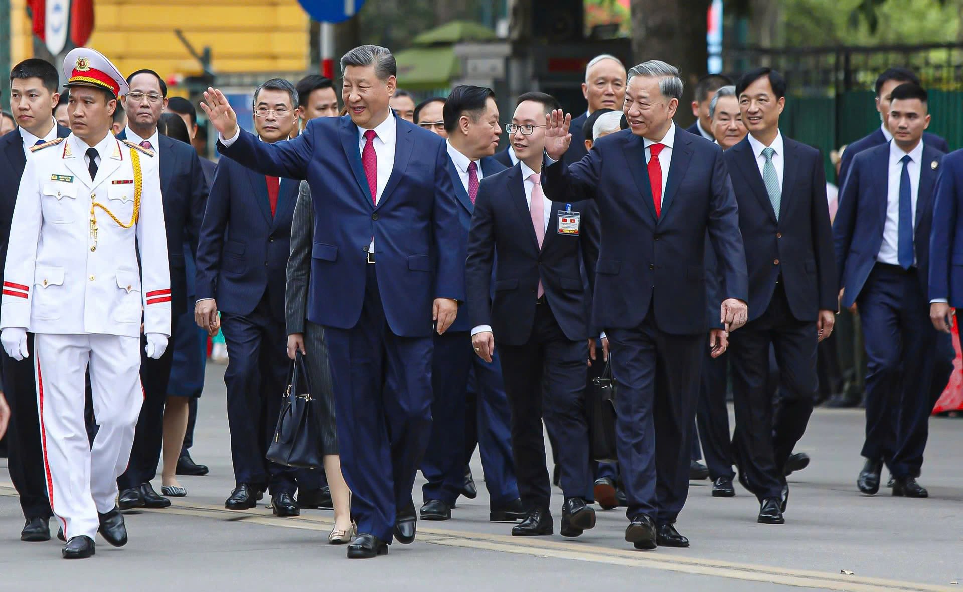 Tổng Bí thư Tô Lâm và Tổng Bí thư Chủ tịch nước Cộng hòa dân chủ nhân dân Trung Hoa Tập Cận Bình đi bộ từ Phủ Chủ tịch sang trụ sở Trung ương Đảng để hội đàm vào tháng 4 năm 2025.