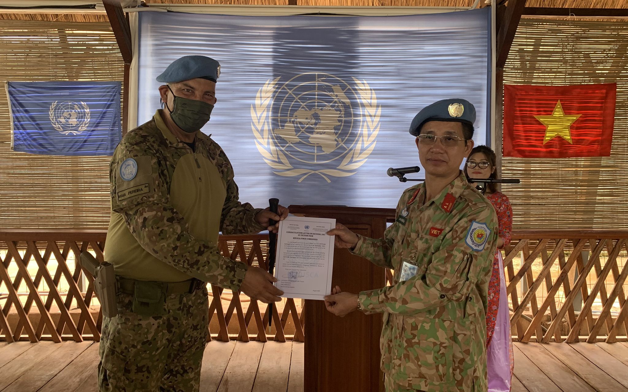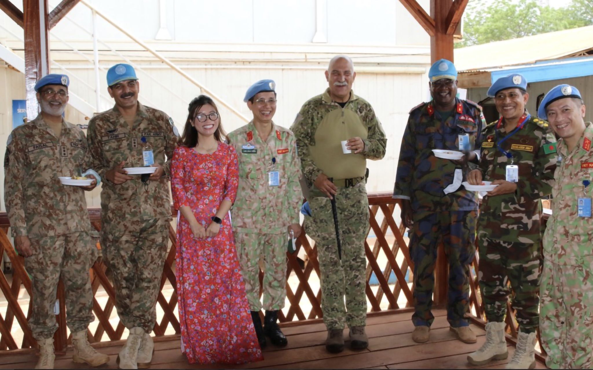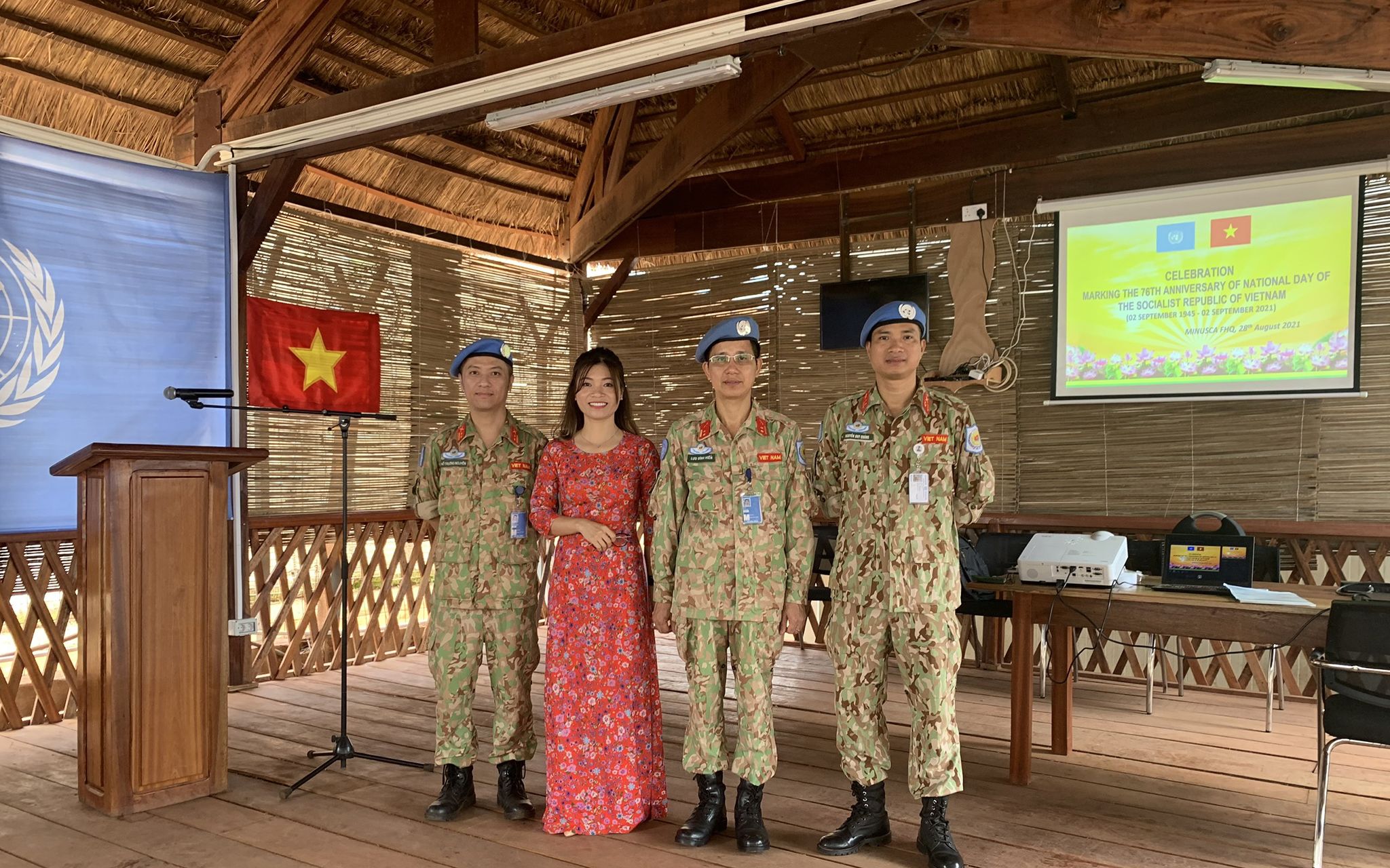 Tự hào biết bao khi đứng trước đông đảo lãnh đạo, đồng nghiệp quốc tế cùng đặt tay lên ngực áo, hát vang bản “Tiến quân ca” trong lễ chào cờ. Bài Quốc ca tôi đã nghe từ khi còn là một cô bé, bài hát quen thuộc như hơi thở, như từng dòng máu chảy trong tim. Vậy mà trong buổi lễ trang trọng này, khi cất tiếng hát, từng câu, từng chữ, từng nốt nhạc vang lên trên một đất nước còn xung đột, còn nội chiến, nơi mà người dân đang khát khao hoà bình, vẫn rung lên trong tôi những cảm xúc nồng nàn.