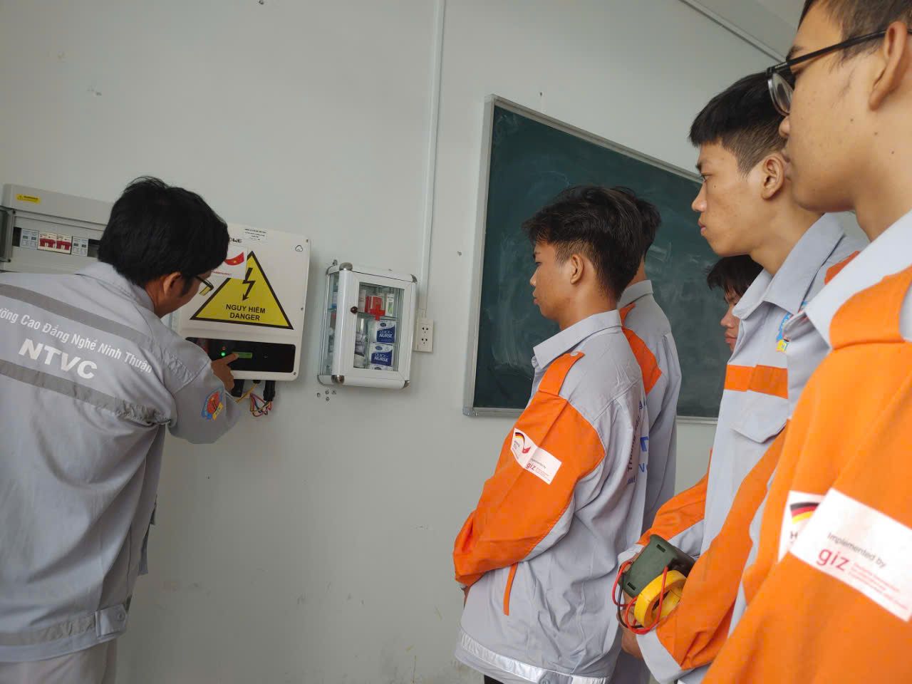 Với sự hỗ trợ từ GIZ, cô đã tham gia các khóa đào tạo chuyên sâu như lắp đặt điện mặt trời áp mái, kỹ thuật an toàn điện gió và nhiều khóa học khác giúp nâng cao năng lực chuyên môn. Những kiến thức mới mẻ này đã không chỉ giúp cô tự tin hơn trong việc giảng dạy mà còn mang đến những phương pháp truyền tải kiến thức hiệu quả hơn cho sinh viên.