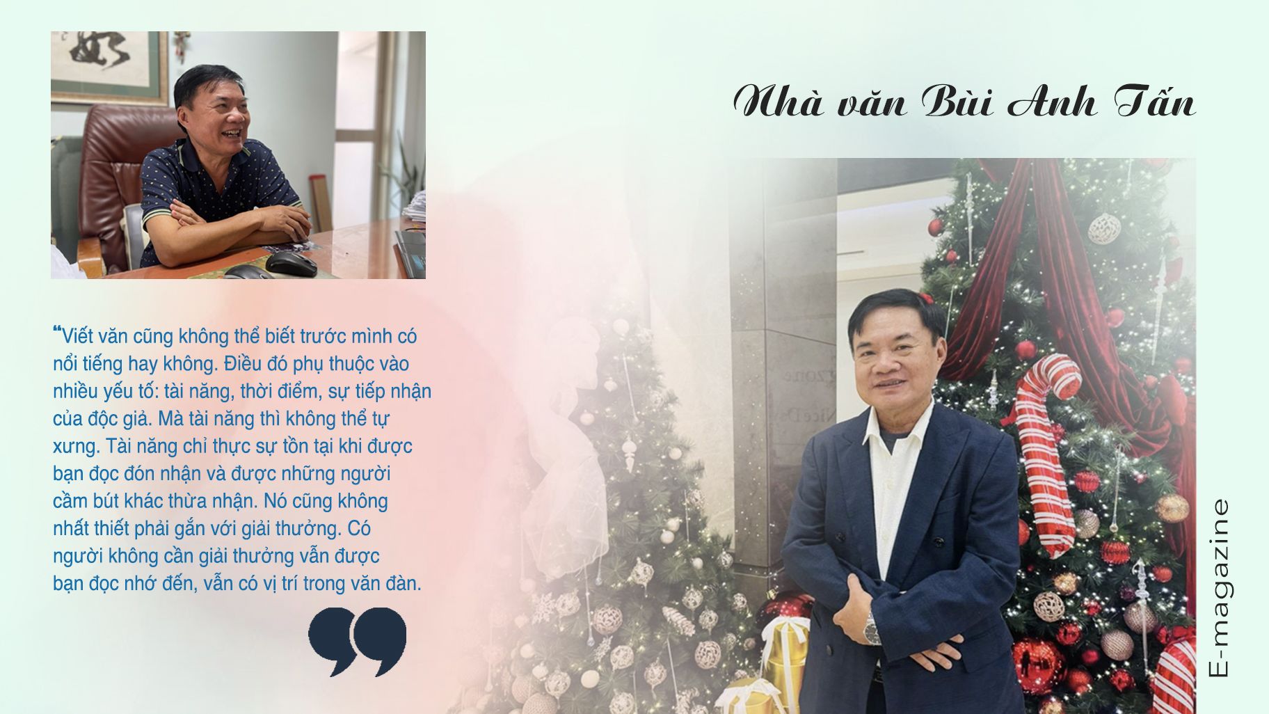 Điều đáng sợ nhất với nhà văn không phải là nghèo hay bận rộn, mà là không viết được. Nhà văn Bùi Anh Tấn cũng đã từng rơi vào khủng hoảng nhiều năm không viết nổi một dòng. Có những khoảng lặng kéo dài vài năm, có những cuốn tiểu thuyết mất chục năm trời mới ra đời, nhưng nghiệp văn chương của ông là thế, luôn đặt ra những thách thức với nội lực ngòi bút của mình. Sinh năm Giáp Ngọ, ông dường như cũng mang những đặc trưng của con giáp này, luôn có sự bền bỉ, giàu năng lượng và một tinh thần không ngừng tìm tòi, làm mới mình qua từng tác phẩm.