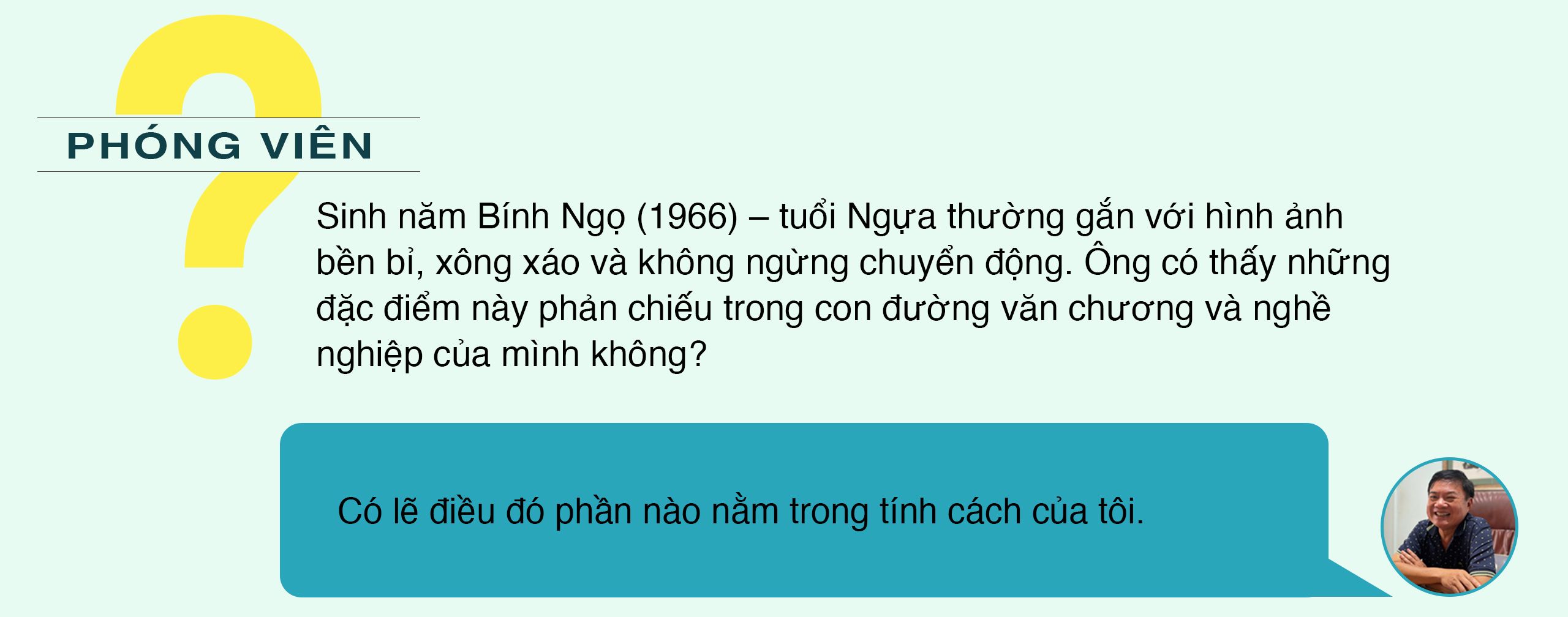 Trong loạt bài đối thoại với các văn nghệ sĩ tuổi Ngọ, chúng tôi được gặp ông đầu tiên, trong cuộc hẹn chóng vánh vào chiều cuối năm tại trụ sở Liên hiệp các Hội Văn học nghệ thuật Thành phố Hồ Chí Minh. Ông đang ngồi suy tư bên những “con chữ” mà ông đã dày công theo đuổi nhiều năm qua – một cuốn tiểu thuyết về lịch sử Việt Nam hàng trăm năm trước. “Rất khó, nhưng khó mấy cũng làm”, ông cười.