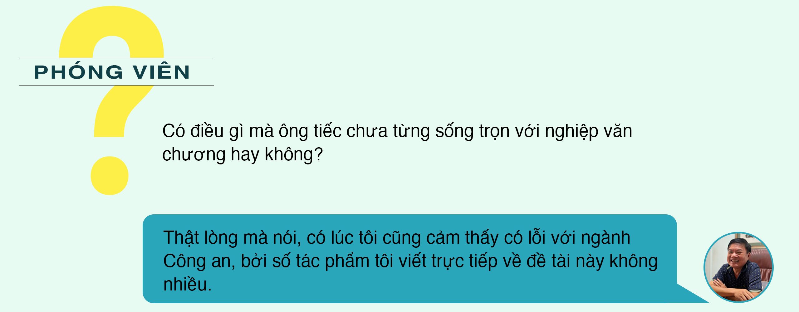 Trước đây, tôi từng được gọi là một “nhà văn Công an” nay vẫn là nhà văn công an (nghỉ hưu). Thật lòng mà nói, có lúc tôi cũng cảm thấy có lỗi với ngành Công an, bởi số tác phẩm tôi viết trực tiếp về đề tài này không nhiều – chỉ một, hai cuốn – còn lại chủ yếu là những tác phẩm viết về đời sống xã hội.