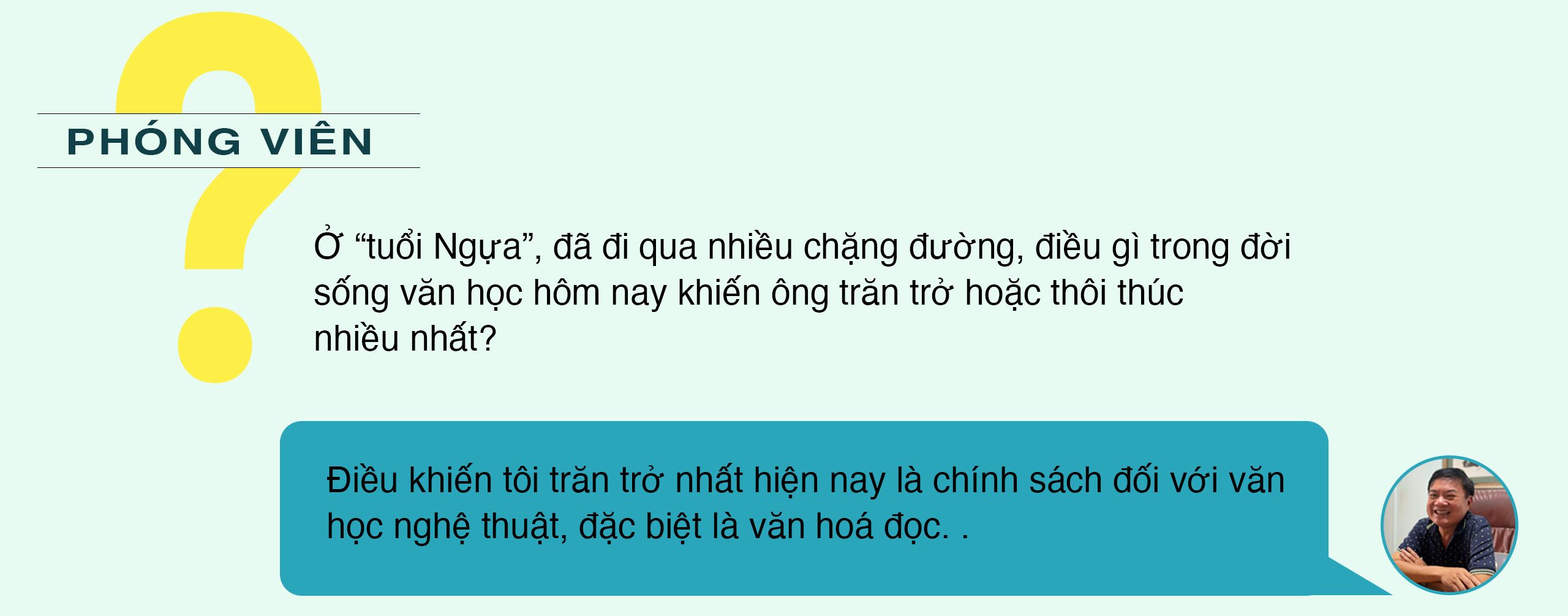 Điều khiến tôi trăn trở nhất hiện nay là chính sách đối với văn học nghệ thuật, đặc biệt là văn hoá đọc. Chúng ta có nhiều hoạt động như đường sách, ngày hội sách, ngày văn hoá đọc… nhưng phần lớn vẫn mang tính phong trào, hình thức, chưa thật sự đi sâu vào đời sống.